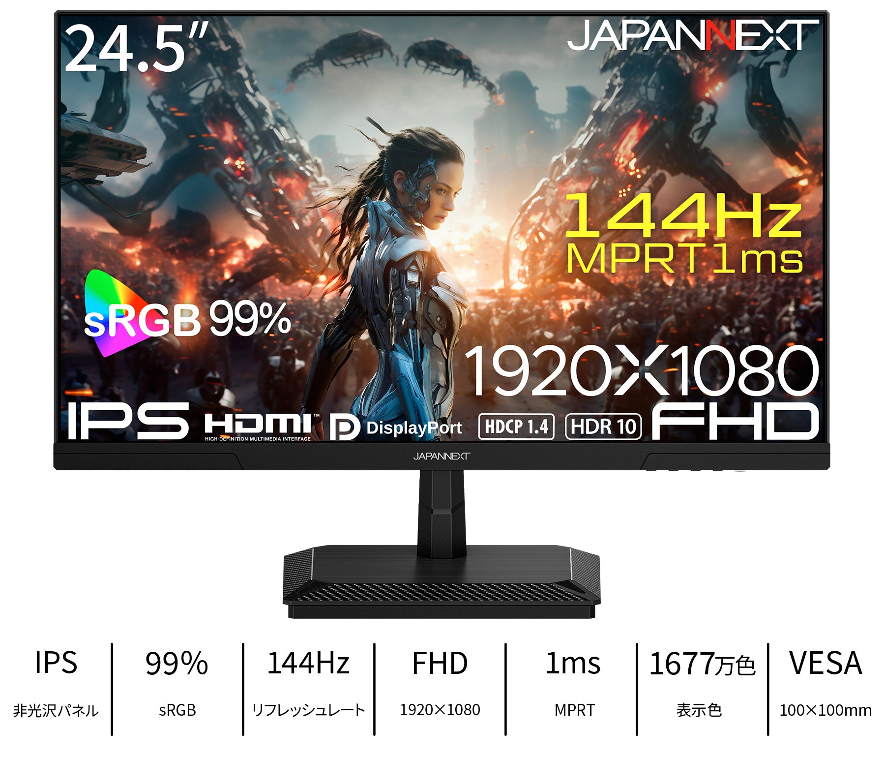 24.5インチのIPSパネルを搭載し、144Hzの高速リフレッシュレートに対応した、フルHD(1920x1080)解像度のゲーミングモニターです。