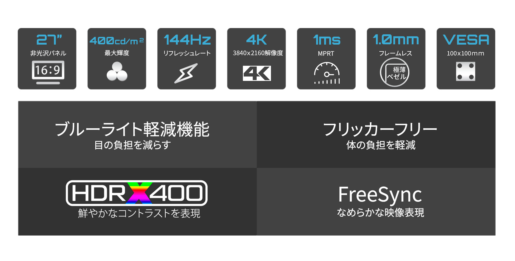 27インチのIPSパネルを搭載、最大144Hzの高速リフレッシュレートに対応した4K解像度(3840x2160)の高解像度を誇るゲーム環境に最適なゲーミングモニターです。