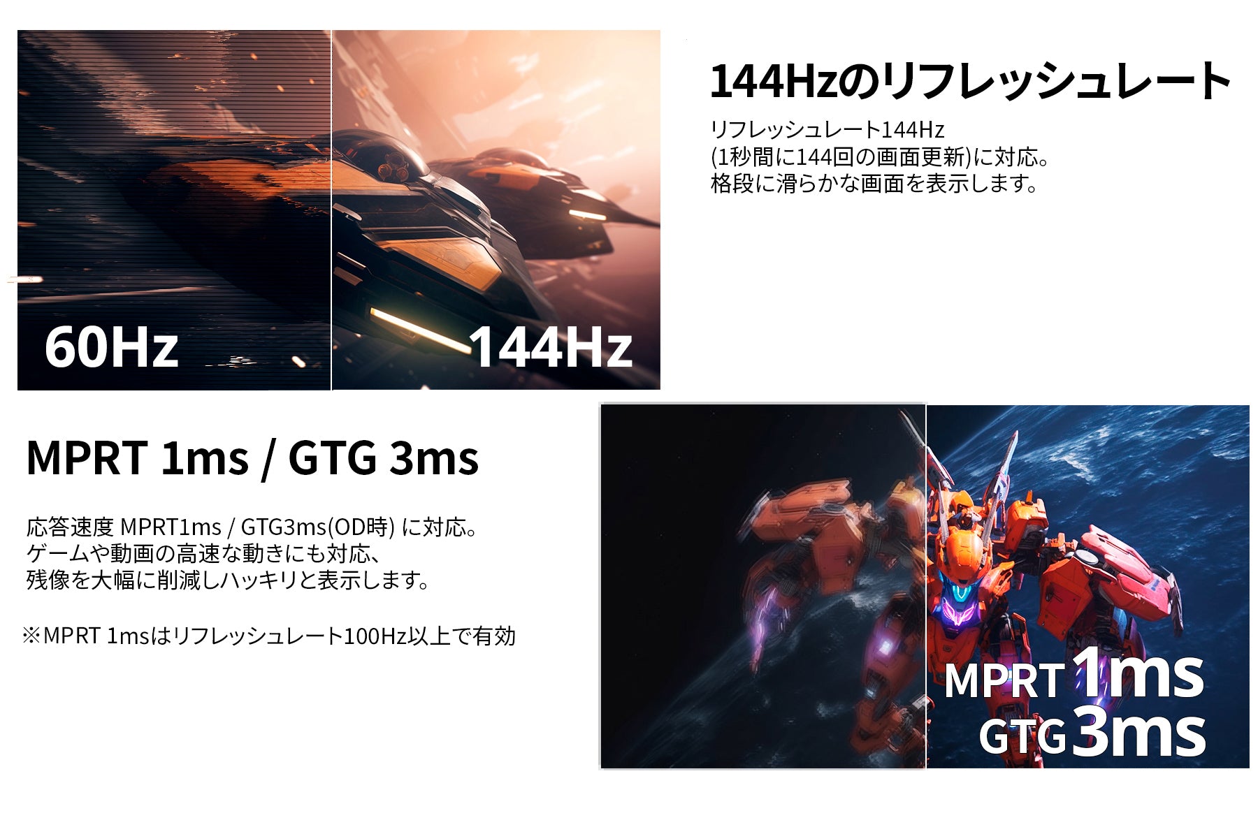 フルHD(1920x1080)解像度の4倍の高解像度は複数のウィンドウの同時表示を可能にし、圧倒的な高生産性を実現します。144Hzの高速リフレッシュレート、1ms(MPRT)の高速応答速度に対応。高精細で滑らかな表現を可能にし、FPSなどの動きの速いゲームで快適なゲームプレイを実現します。※MPRT 1msはリフレッシュレート100Hz以上で有効。あらゆる角度から見ても色やコントラストの変化がおきにくいIPSパネルを搭載し、広視野角上下左右178°を実現します。