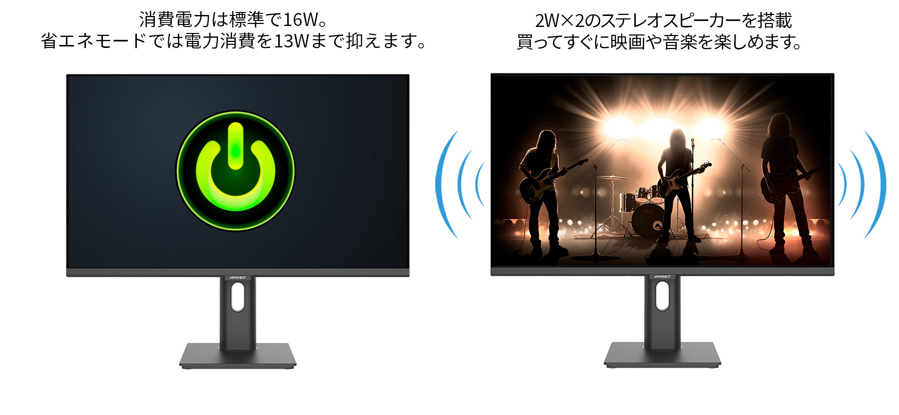あらゆる角度から見ても色やコントラストの変化がおきにくいIPSパネルを搭載し、広視野角上下左右178°を実現します。最大輝度350cd/m2、sRGB:100%の広色域に対応した液晶パネルは、コンテンツを色鮮やかに映し出します。