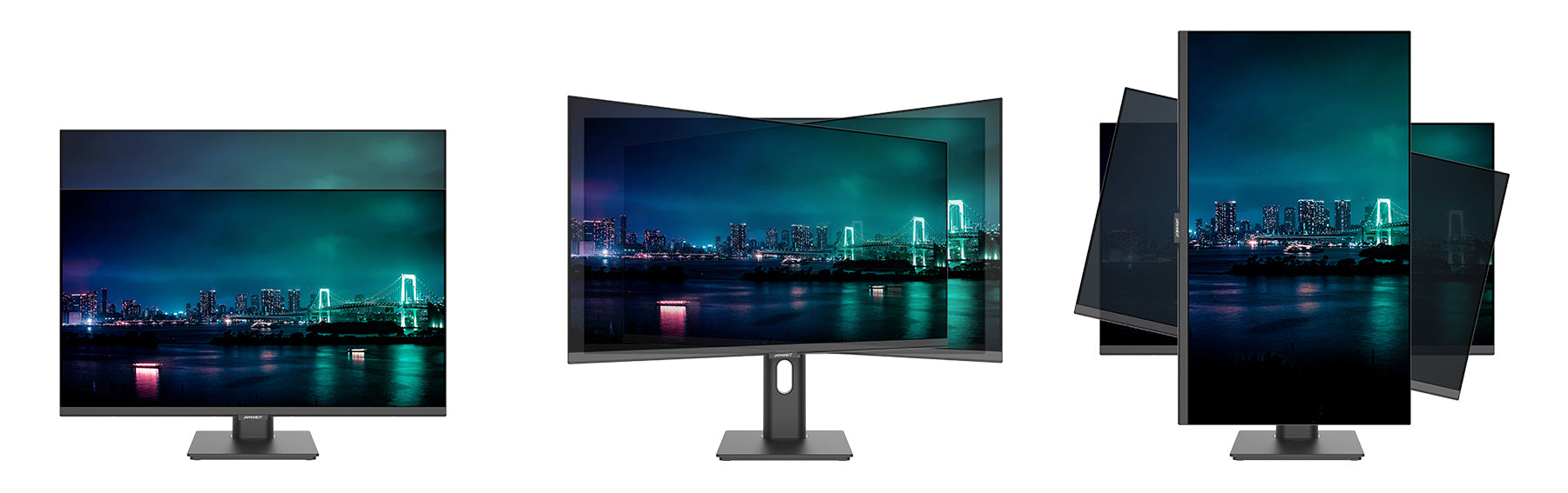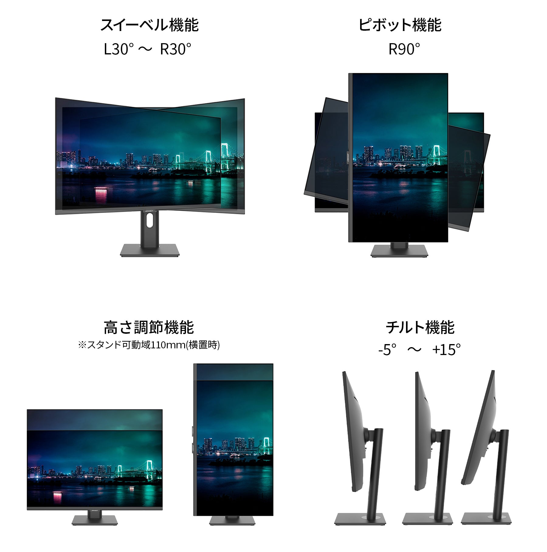 高さ調整が可能な昇降式スタンドを搭載。最大110mm(横置時)の範囲内で最適な高さに画面を調整可能です。また縦画面として使用出来るピボット(回転)機能にも対応します。