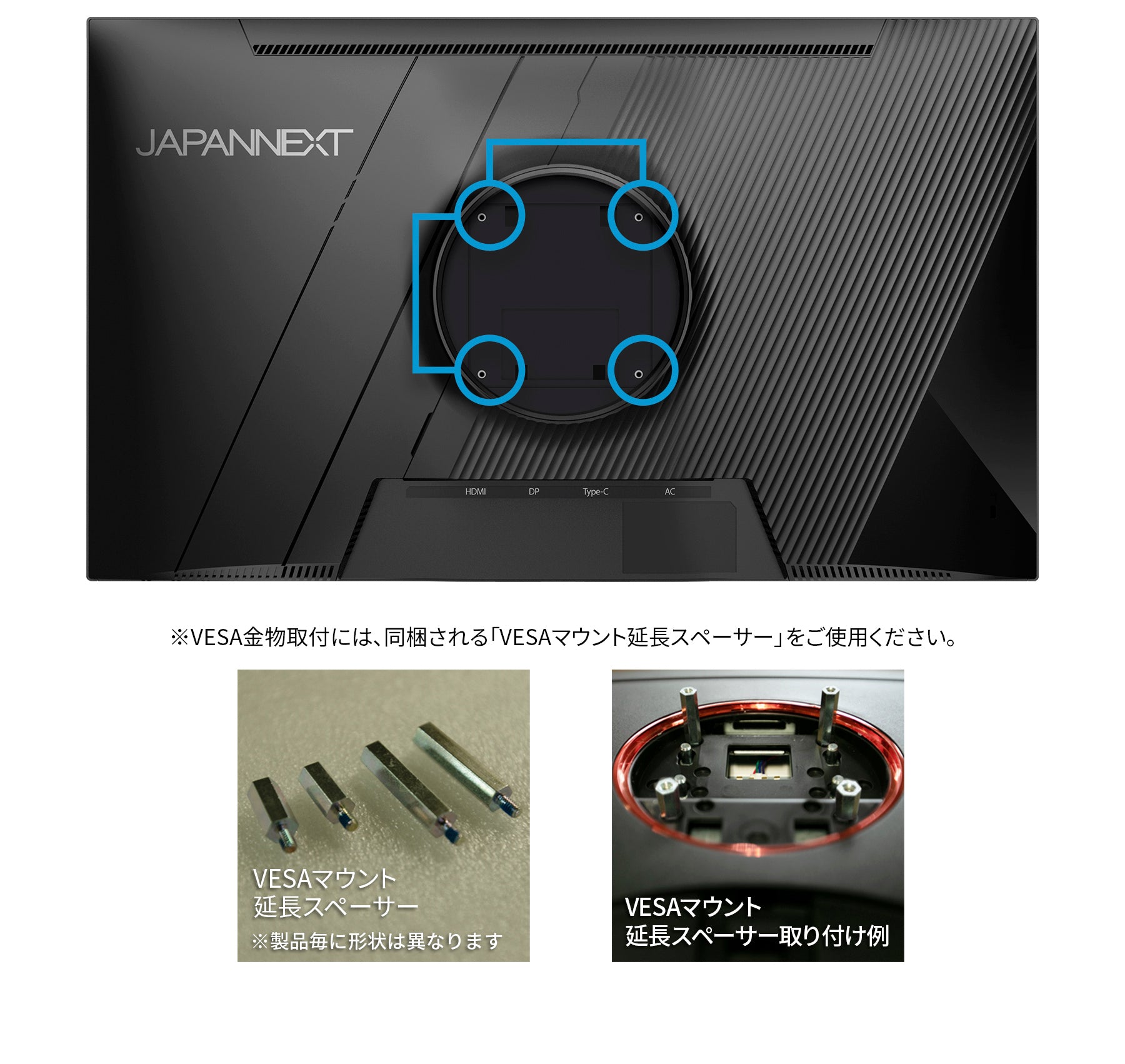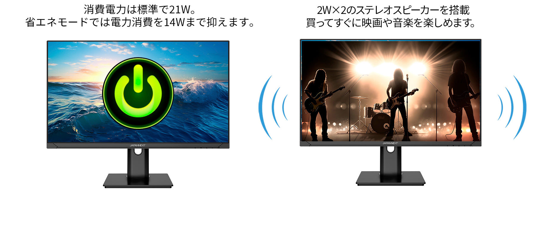 75x75mmのVESAマウントに対応しますので、別売りのモニターアームなどに使用が可能です。2Wx2のスピーカーを内蔵しております。