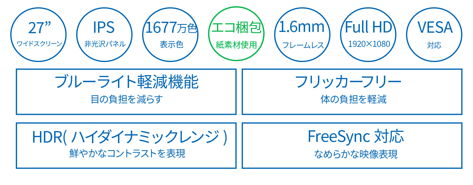 長時間使用時に眼に優しいフリッカーフリー(ちらつき軽減)、ブルーライト軽減モードを搭載します。