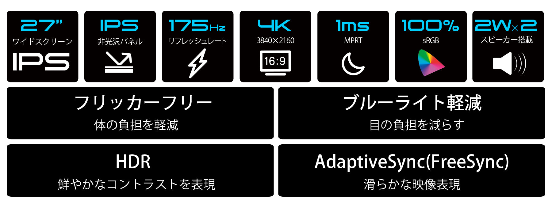 AdaptiveSync(FreeSync)に対応。画面のリフレッシュレートとコンテンツのフレームレートのズレから生じるティアリングを防ぎ、滑らかで美しい映像を実現します。また、長時間使用時に眼に優しいフリッカーフリー(ちらつき軽減)、ブルーライト軽減モードを搭載します。