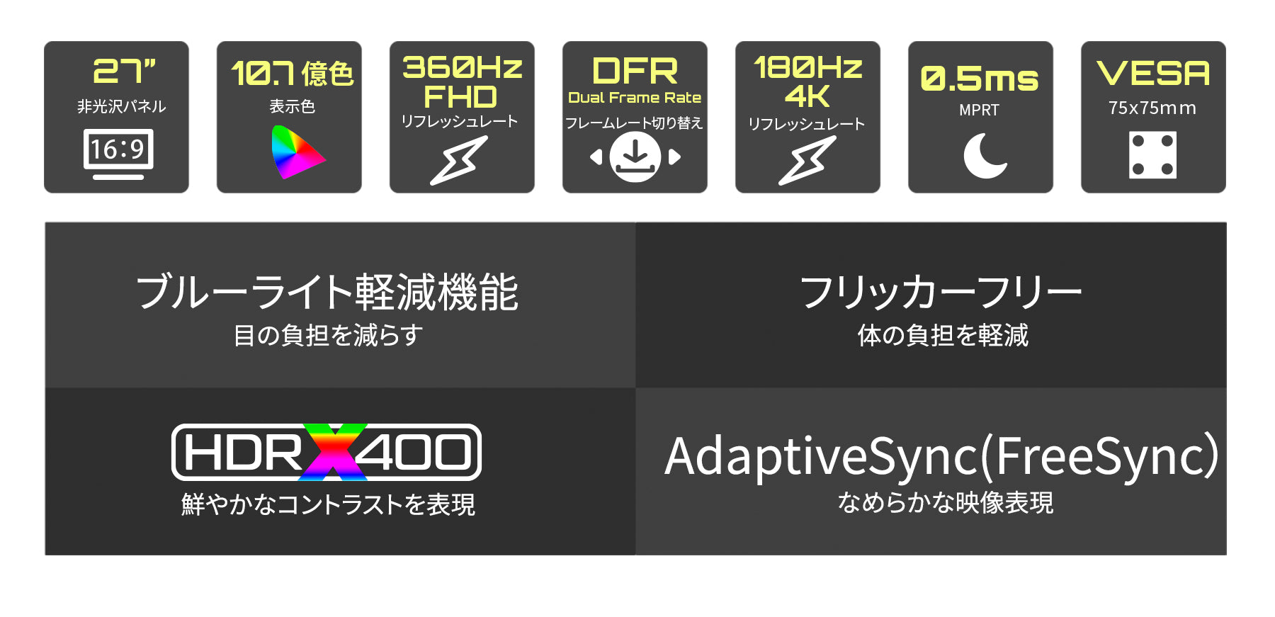 DFR(Dual Frame Rate)に対応。用途やコンテンツに応じて、解像度/リフレッシュレートをボタンひとつで簡単に切り替え可能です。グラフィックを楽しむ4Kゲームを180Hzのリフレッシュレートで快適に、動きの速いFPSなどのゲームでは、フルHDで最大360Hzの高速リフレッシュレートによるスムーズなプレイが可能となり、1台で様々なジャンルのゲームを楽しめます。※モニター側でDFRを有効にできますが、反映にはゲームの再起動が必要です。ゲーム起動後の変更はできないため、事前に設定してください。
