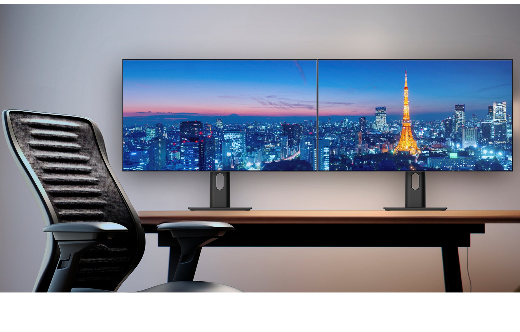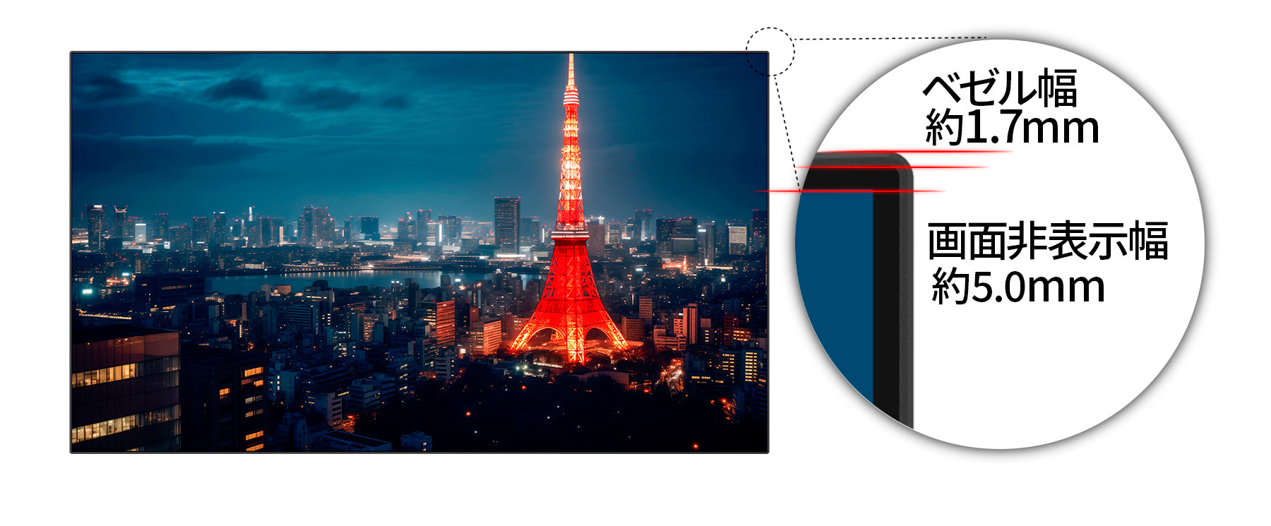 4辺フレームレスデザインを採用。浮かび上がるようにコンテンツを鮮やかに映し出します。4辺狭額縁パネルによる省スペース設計を行い、置く場所にも困らない使いやすいサイズを実現しました。また複数並べて使用するマルチディスプレイ構成にも最適です。