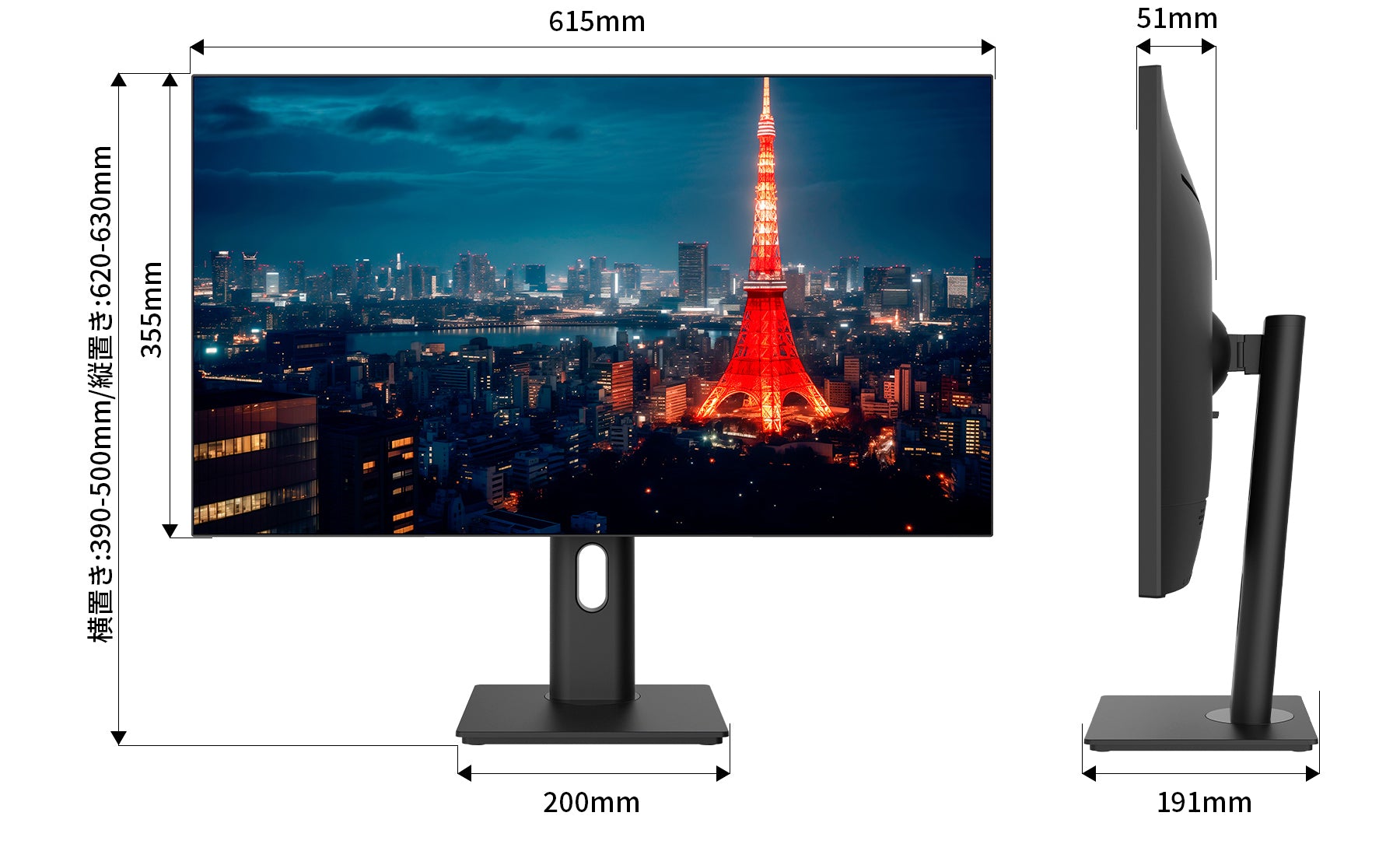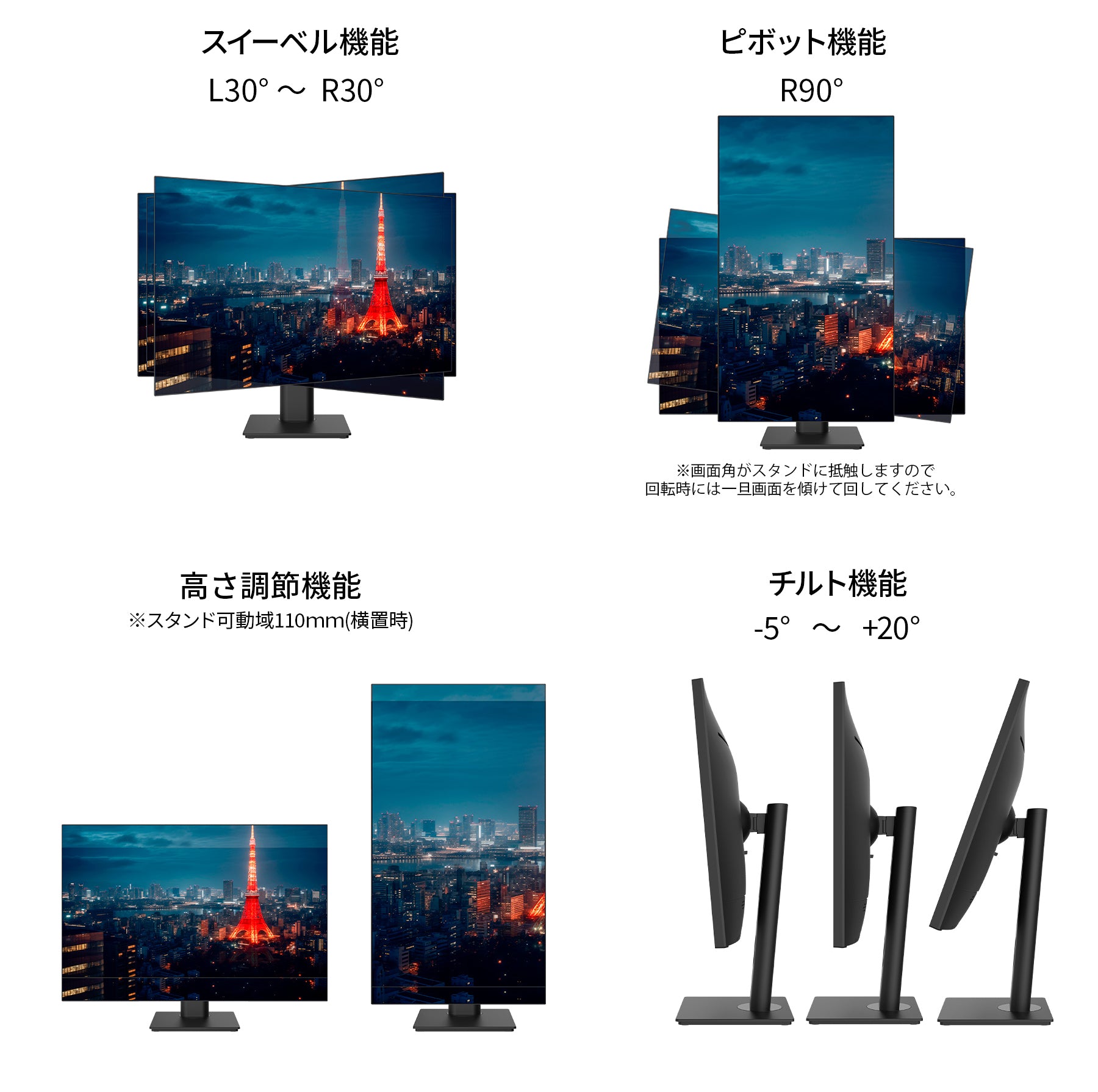 高さ調整が可能な、昇降式スタンドを採用。110mm(横置時)の範囲でお好みの高さにモニターの高さを調整出来ます。さらにピボット機能を搭載で90度回転させて縦での使用も可能です。