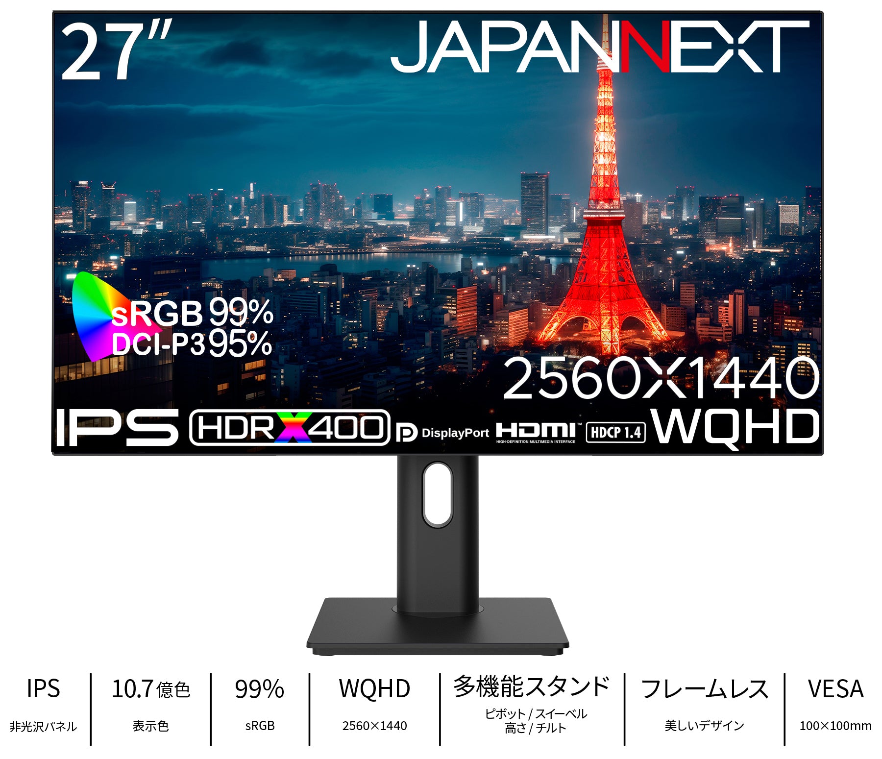 27インチのIPSパネルを搭載、WQHD(2560x1440)解像度で便利な昇降式スタンドを搭載し、4辺フレームレスデザインを採用した液晶モニターです。