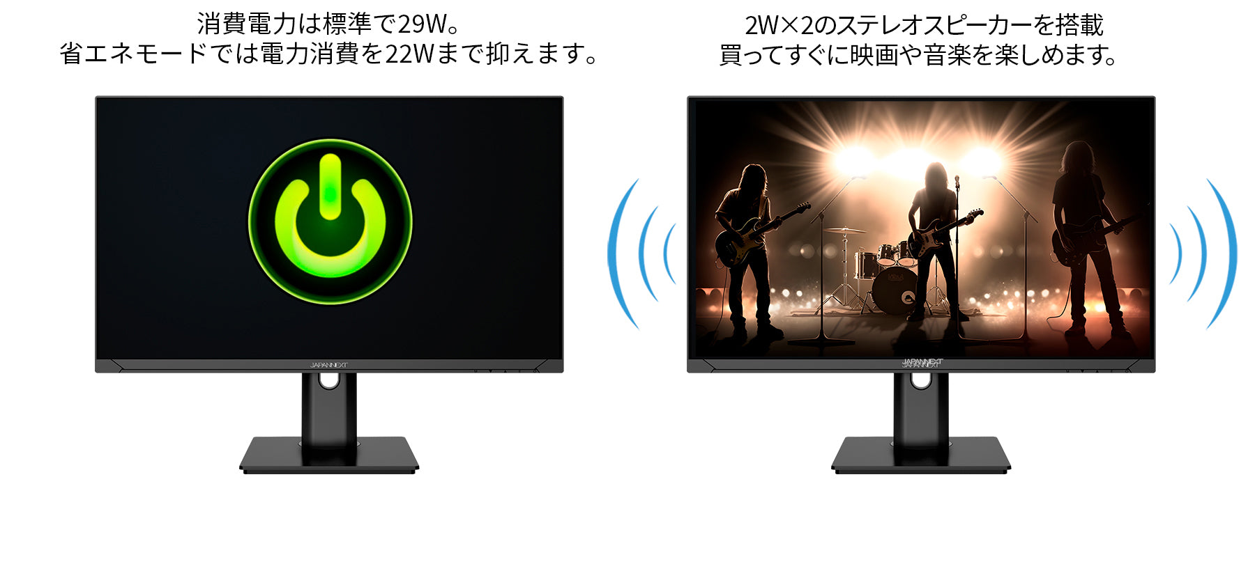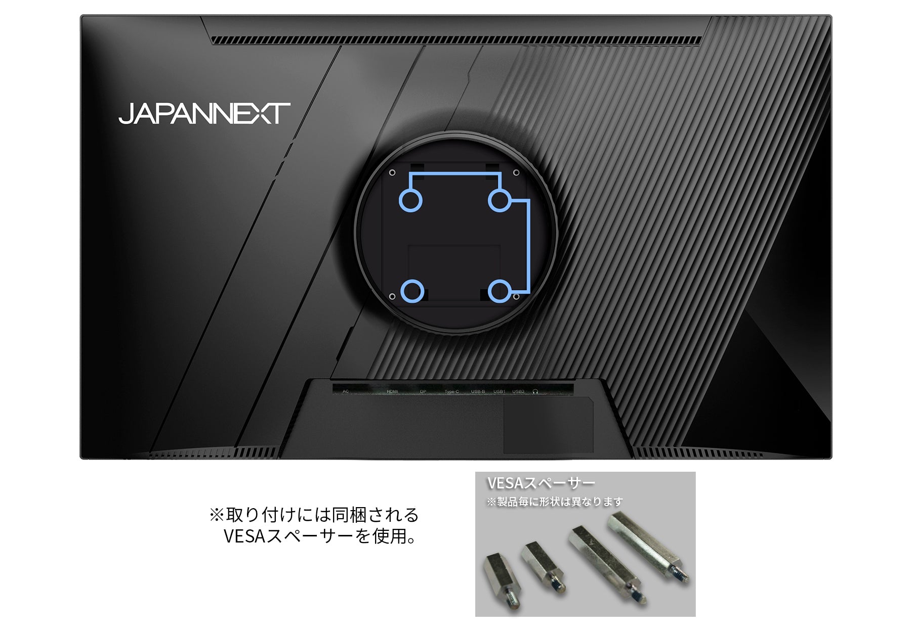 75x75mmのVESAマウントに対応しますので、別売りのモニターアームなどに使用が可能です。2Wx2のスピーカーを内蔵します。