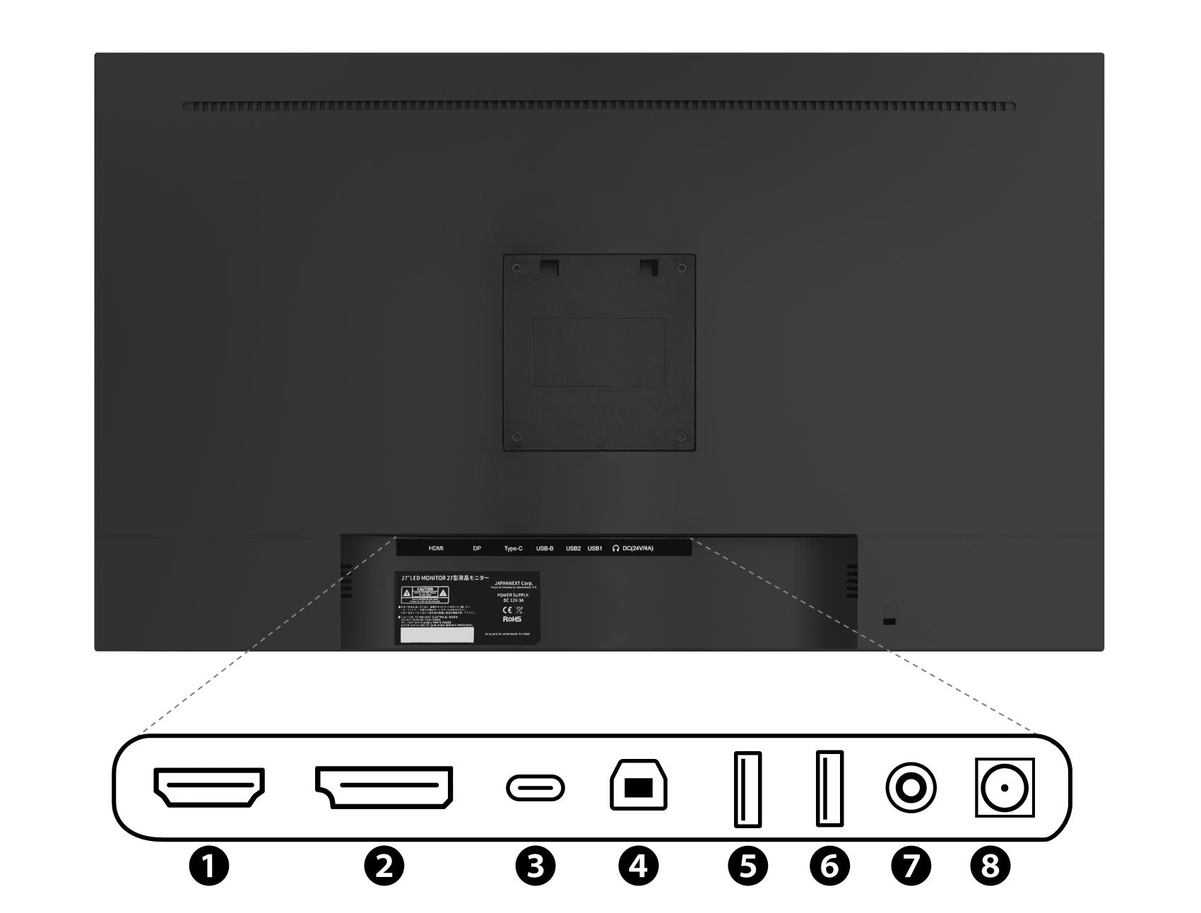 映像入力端子はHDMI1.4 x1 DisplayPort1.2 x1、USB-C(65W給電)x1を装備。様々なタイプの機器との接続が可能です。USB-C(65W給電)は、対応のPCであればUSB-Cケーブル1本でモニターへの映像出力とノートPCへの給電が可能。ケーブル1本でスッキリ接続出来るだけでなく、テレワーク、出社併用の場合などノートPCのACアダプターを持ち運ぶ必要が無くなります。