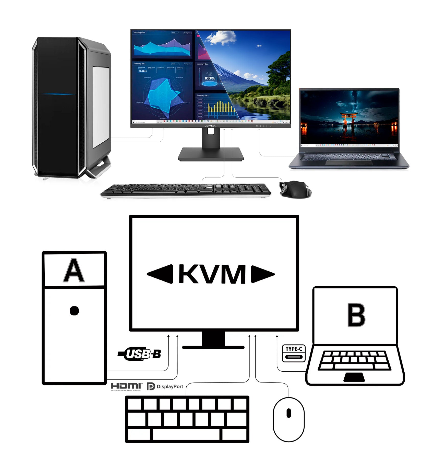 さらにKVM機能に対応、モニターに接続したキーボード、マウスをデスクトップPCやUSB Type-C接続のノートPCで入力を切り替えても使用可能です。