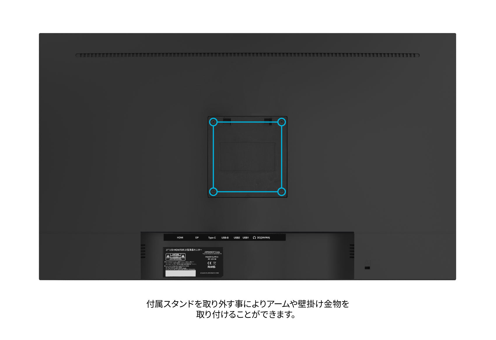 100mmx100mmのVESAマウントに対応しているので別売のモニターアームやモニタースタンドへの取り付けが可能です。