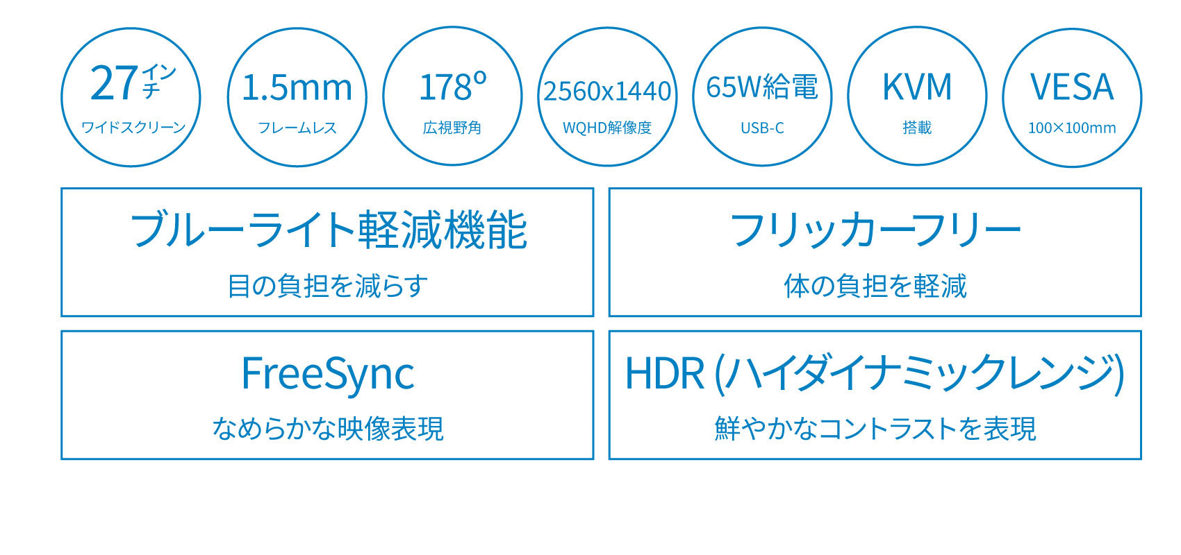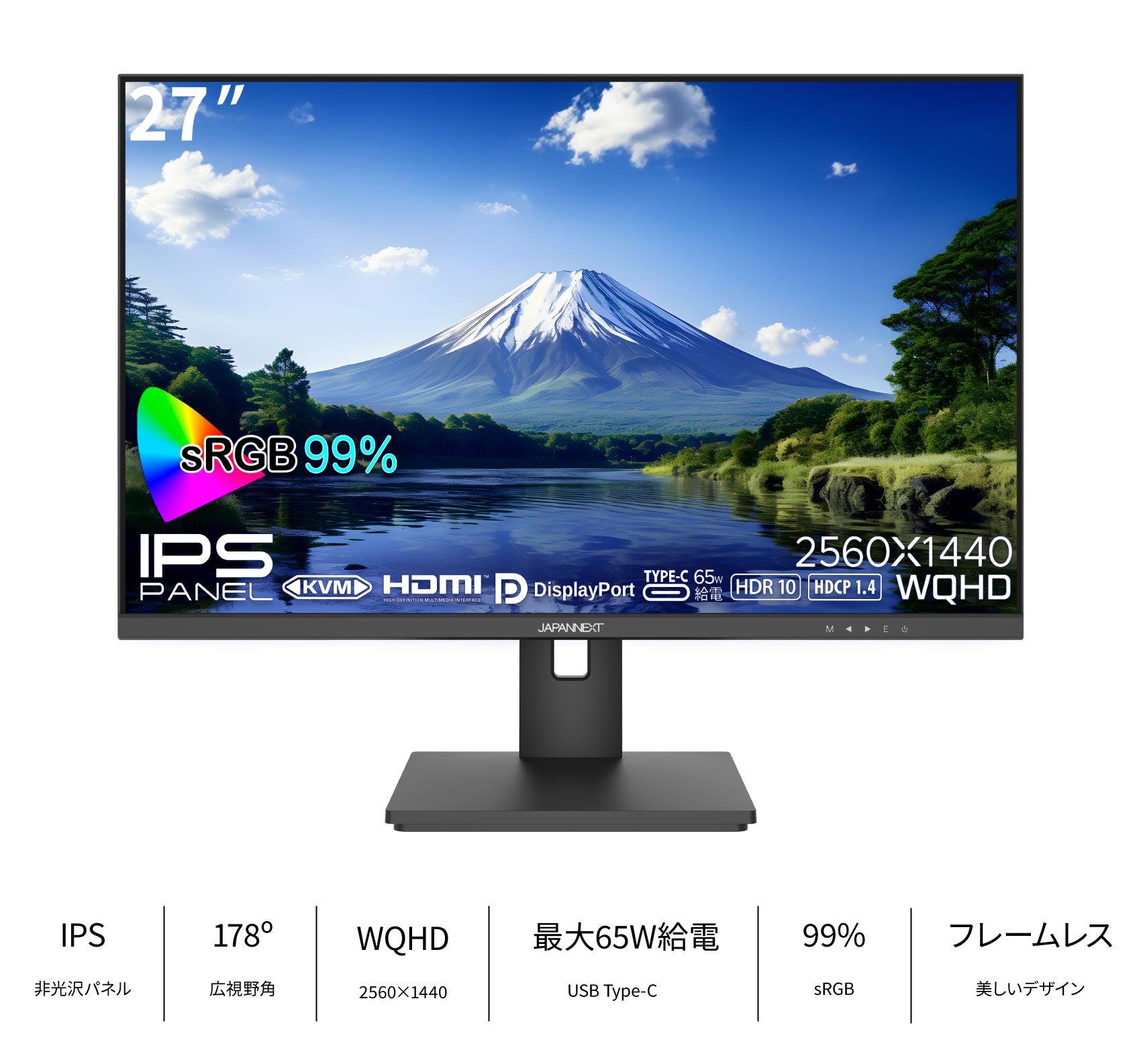 27インチのIPSパネルを採用し、WQHD(2560 x 1440)解像度に対応した液晶モニターです。