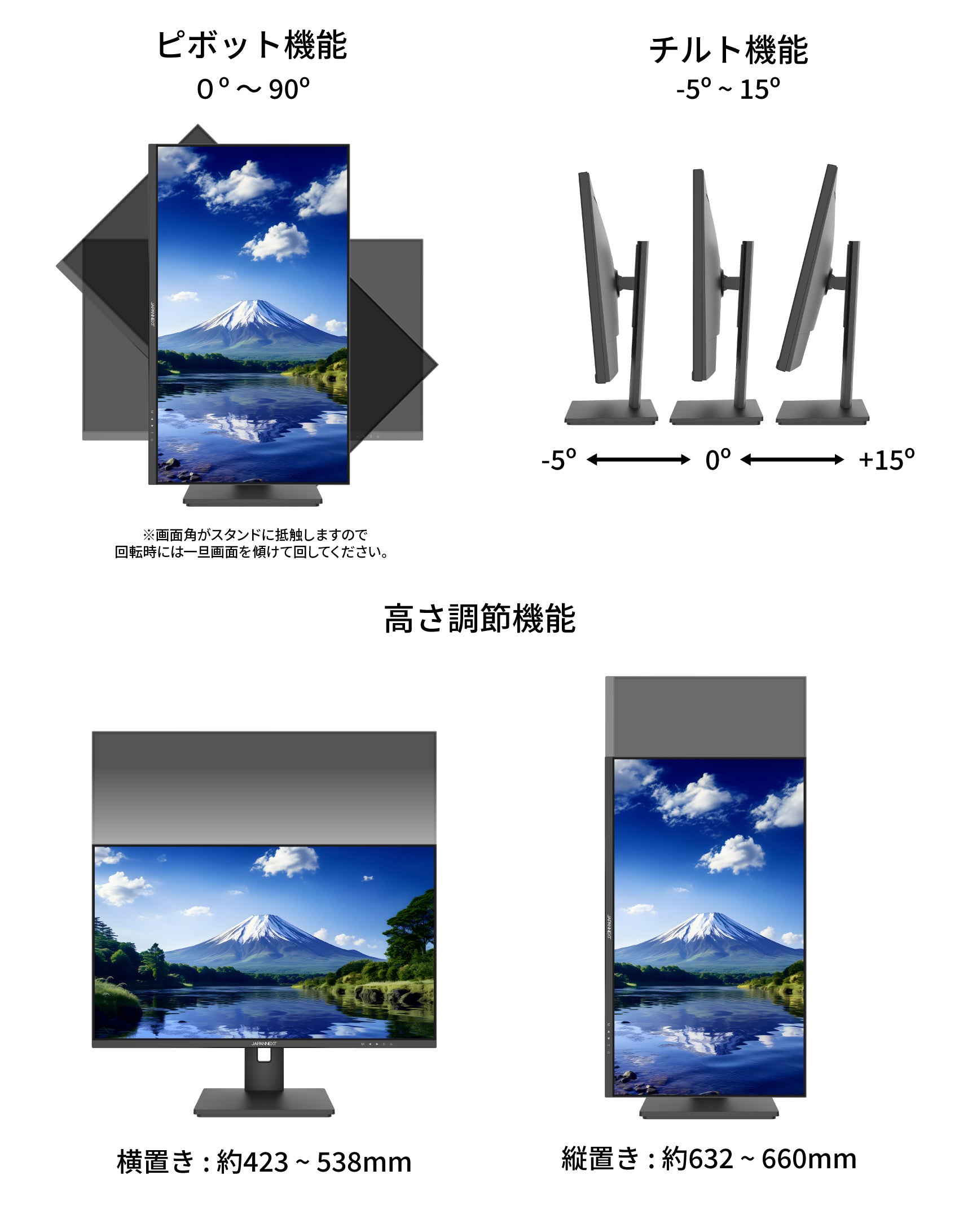 高さ調整が可能な、昇降式スタンドを採用。115mmの範囲でお好みの高さにモニターの高さを調整出来ます。さらにピボット機能を搭載で90度回転させて縦での使用も可能です。