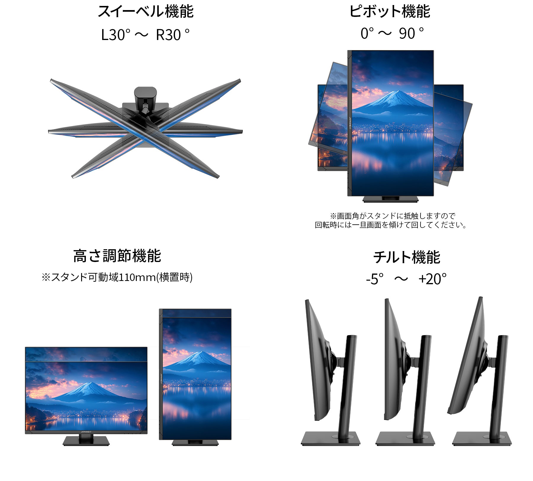 高さ調整が可能な昇降式多機能スタンドを搭載、最大110mmの範囲(横置時)で最適な高さに画面を調整可能です。また、縦画面として使用出来るピボット(回転)機能にも対応します。スイーベル(首振り)機能は、左右各30°の範囲で動かせます。