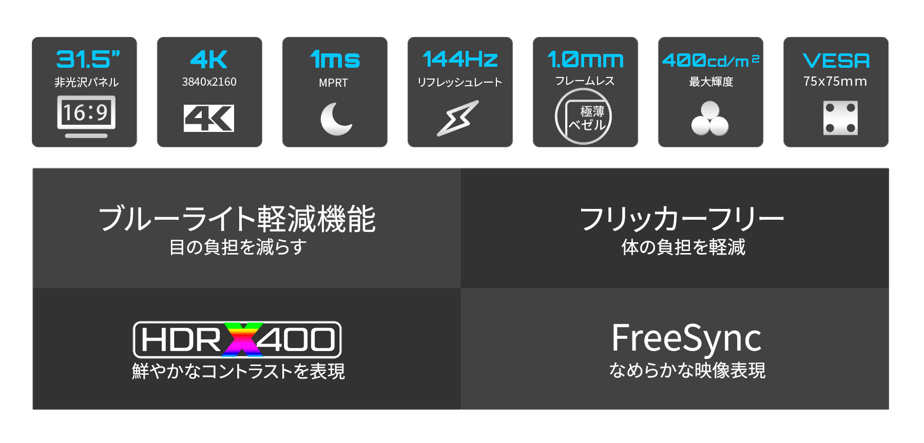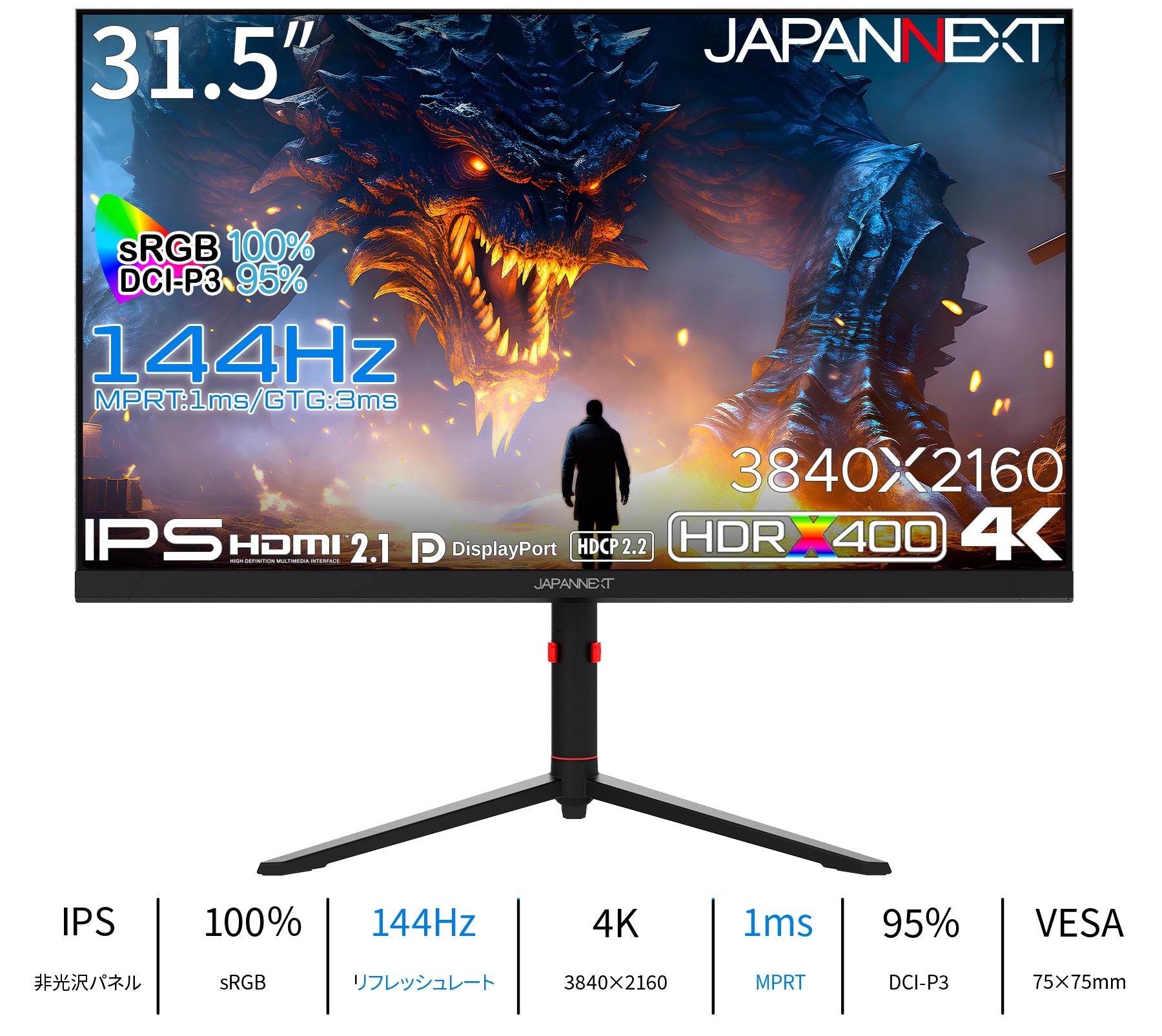 31.5インチのIPSパネルを採用した4K(3840x2160)解像度の液晶モニターです。4KはフルHD(1920×1080)解像度の約4倍の作業領域を実現する3840×2160ドットの解像度となり、高精細な表示を実現できます。