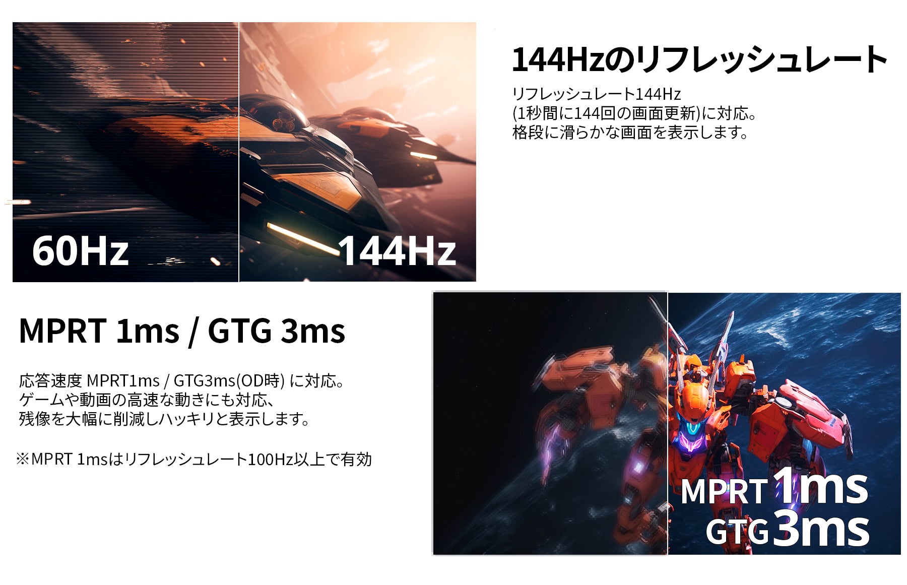 144Hzの高速リフレッシュレート、1ms(MPRT)の高速液晶応答速度に対応。高精細で滑らかな表現を可能にし、FPSなどの動きの速いゲームで快適なゲームプレイを実現します。※MPRT 1msはリフレッシュレート100Hz以上で有効。ゲーミングPCだけでなく、PS5との4K 120Hz接続に対応し、大画面で高精細なゲームを存分に楽しめます。