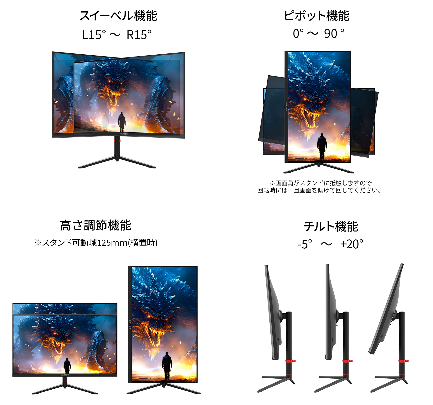 最大125mm(横置時)の範囲で高さを調整出来る昇降式スタンドを採用、お好みの高さにモニターを固定できます。さらにピボット(回転)機能にも対応、縦でも使用することが出来ます。