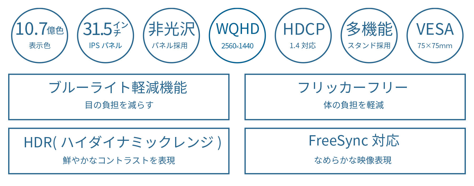 大画面31.5インチのIPSパネルを搭載、WQHD(2560x1440)解像度に対応した液晶モニターです。フルHD(1920x1080)より+78%も高精細でデスクワーク使用時には画面を広く、また写真や動画視聴の際はさらに美しく表示します。