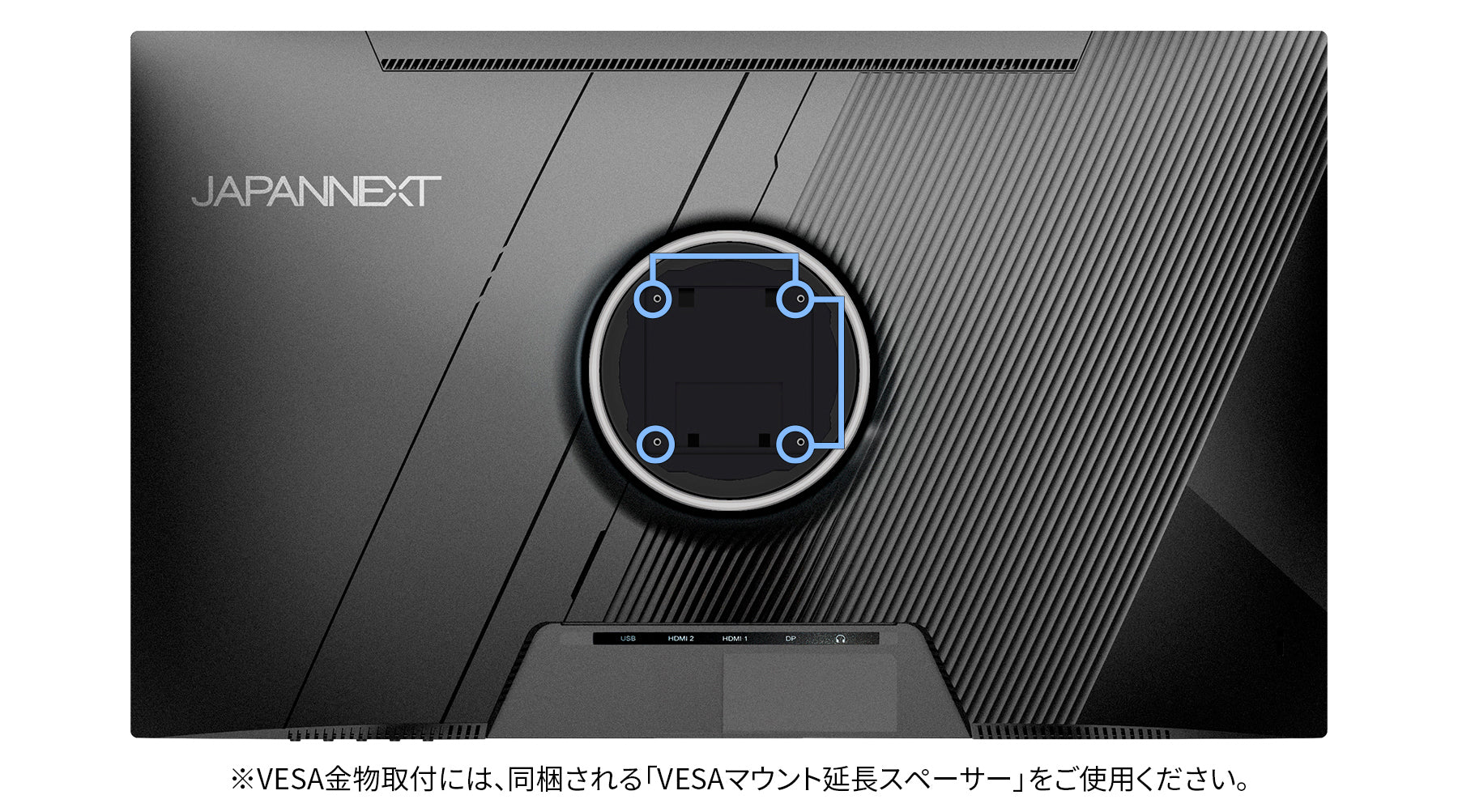 75x75mmのVESAマウントに対応(同梱のVESAマウント延長スペーサーを使用)しているので別売のモニターアームやモニタースタンドなどへの取り付けが可能です。