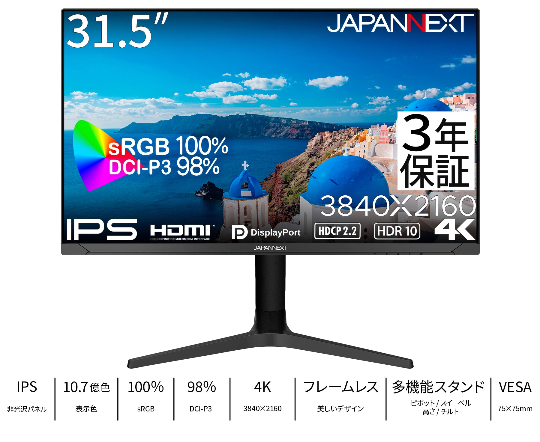 31.5インチのIPSパネルを採用した4K(3840x2160)解像度の液晶モニターです。4KはフルHD(1920×1080)解像度の約4倍の作業領域を実現する3840×2160ドットの解像度となり、高精細な表示を実現できます。