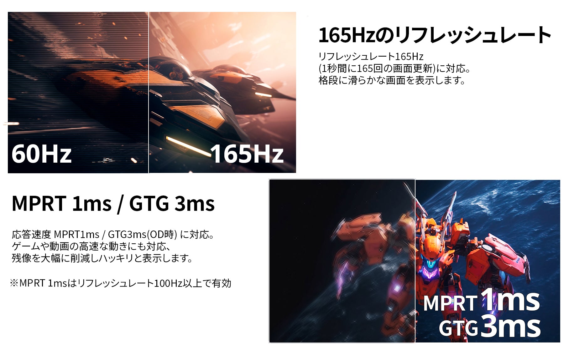 WQHD(2560x1440)解像度はフルHD(1920x1080)解像度より+78%も高精細でデスクワーク使用時には画面を広く、また写真や動画視聴の際はさらに美しく表示します。165Hzの高速リフレッシュレートと1ms(MPRT)の応答速度を採用、FreeSyncにも対応し、FPSなどの動きの早いゲームプレイに最適です。※MPRT 1msはリフレッシュレート100Hz以上で有効。ゲーミングPCだけでなく、PS5とのWQHD 120Hzに対応し、大画面で高精細なゲームを存分に楽しめます。
