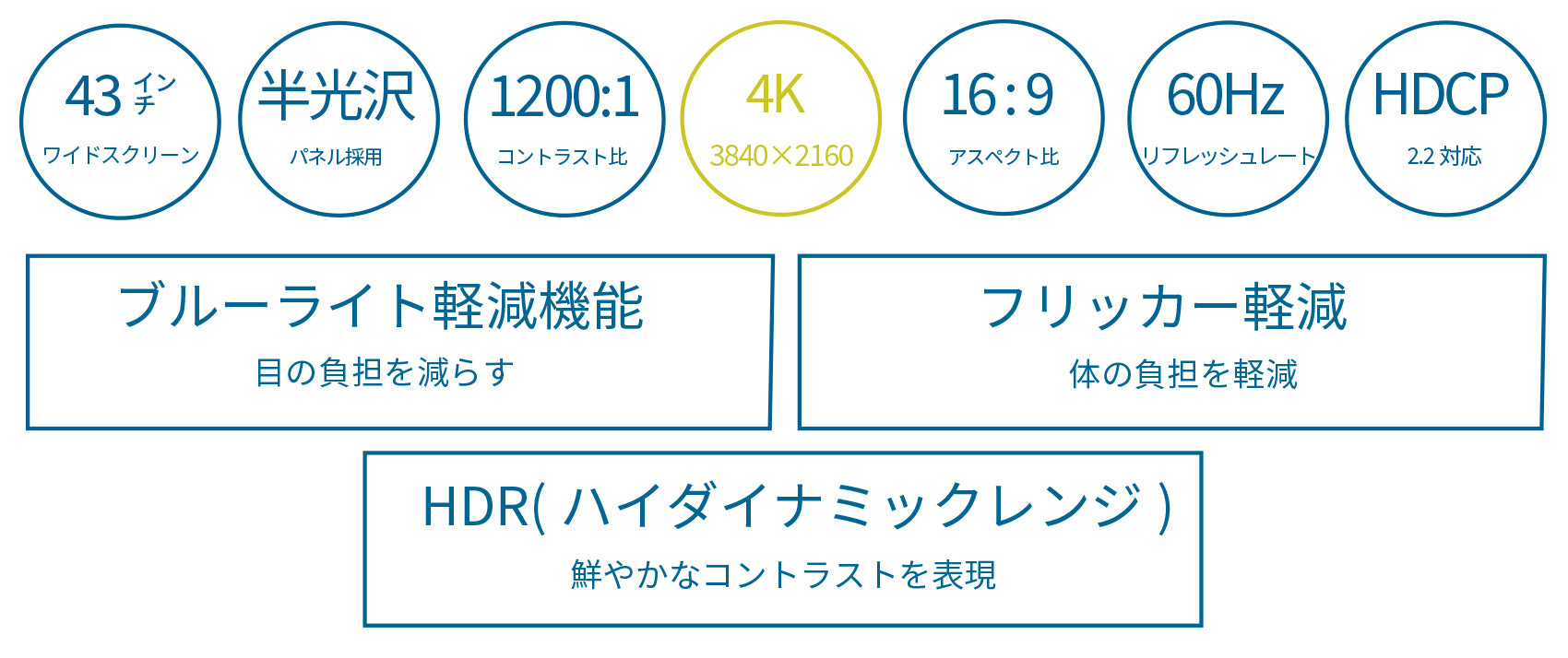 Amazon限定デザインのスタンドを採用、4K解像度に対応したHDR対応大型液晶モニターとなります。43インチの大画面で4K(3840x2160)解像度に対応。4KはフルHD(1920×1080)の約4倍の作業領域を実現する3840×2160ドットの解像度となり、高精細な表示を実現できます。大画面液晶は大きな会議室での使用はもちろん、サイネージ用途や、映画などの鑑賞等様々な用途にお使いいただけます。
