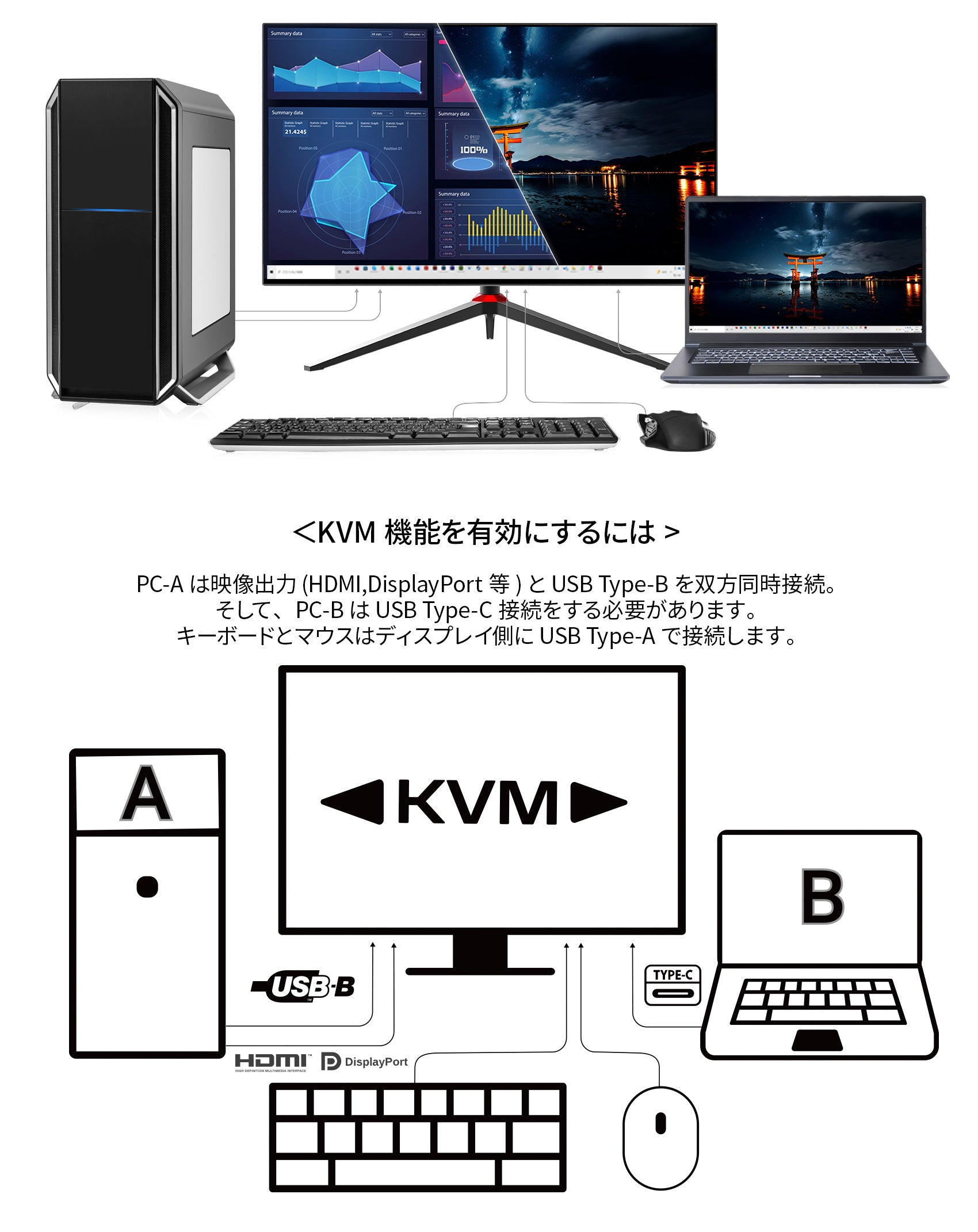 さらにKVM機能に対応、モニターに接続したキーボード、マウスをデスクトップPCやUSB Type-C接続のノートPCで入力を切り替えた際にそのまま使用可能です。