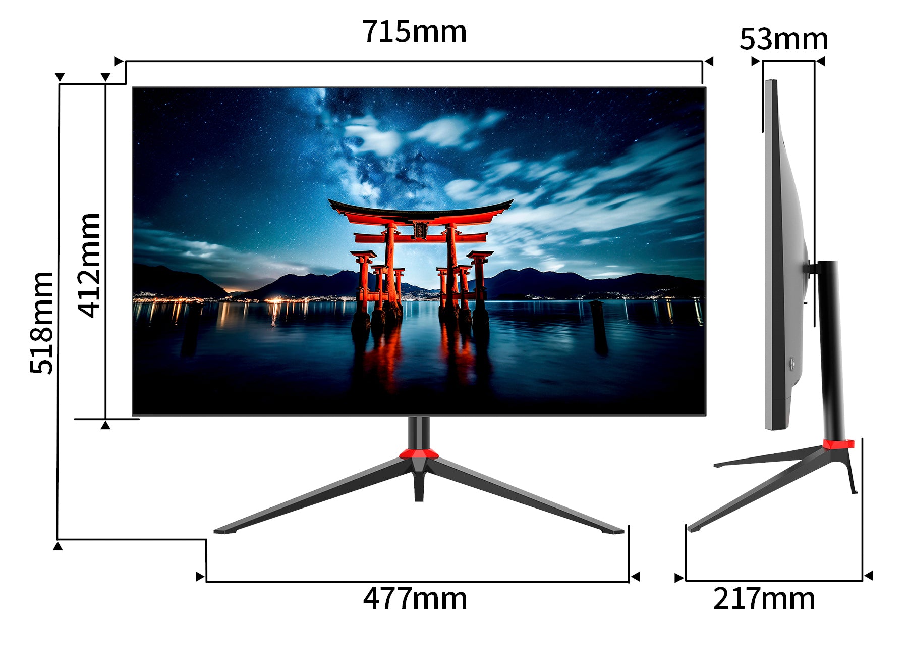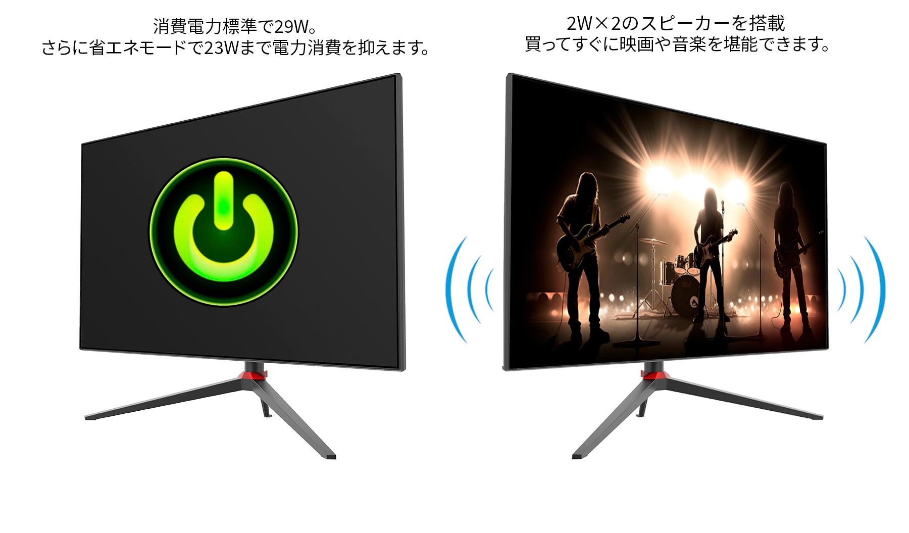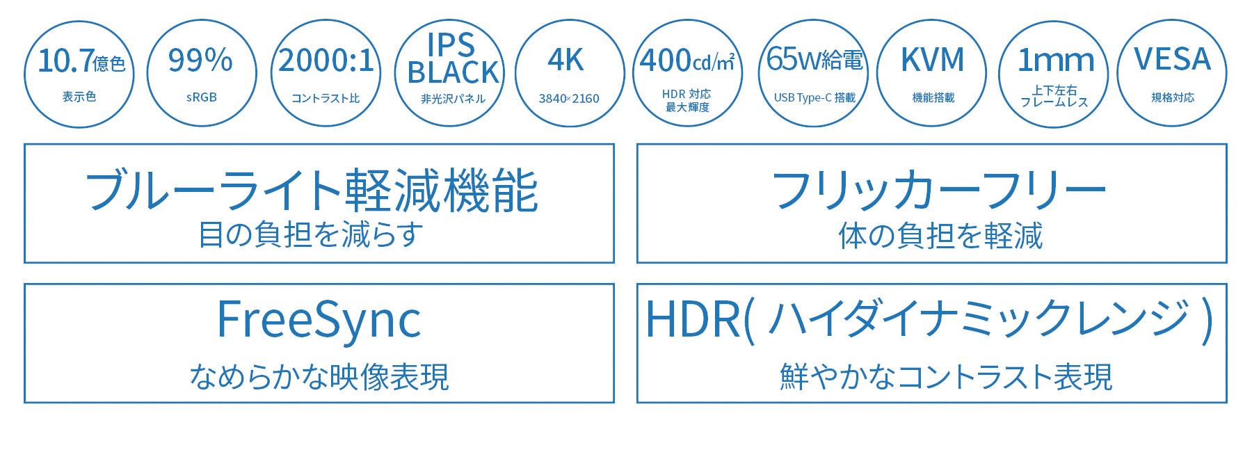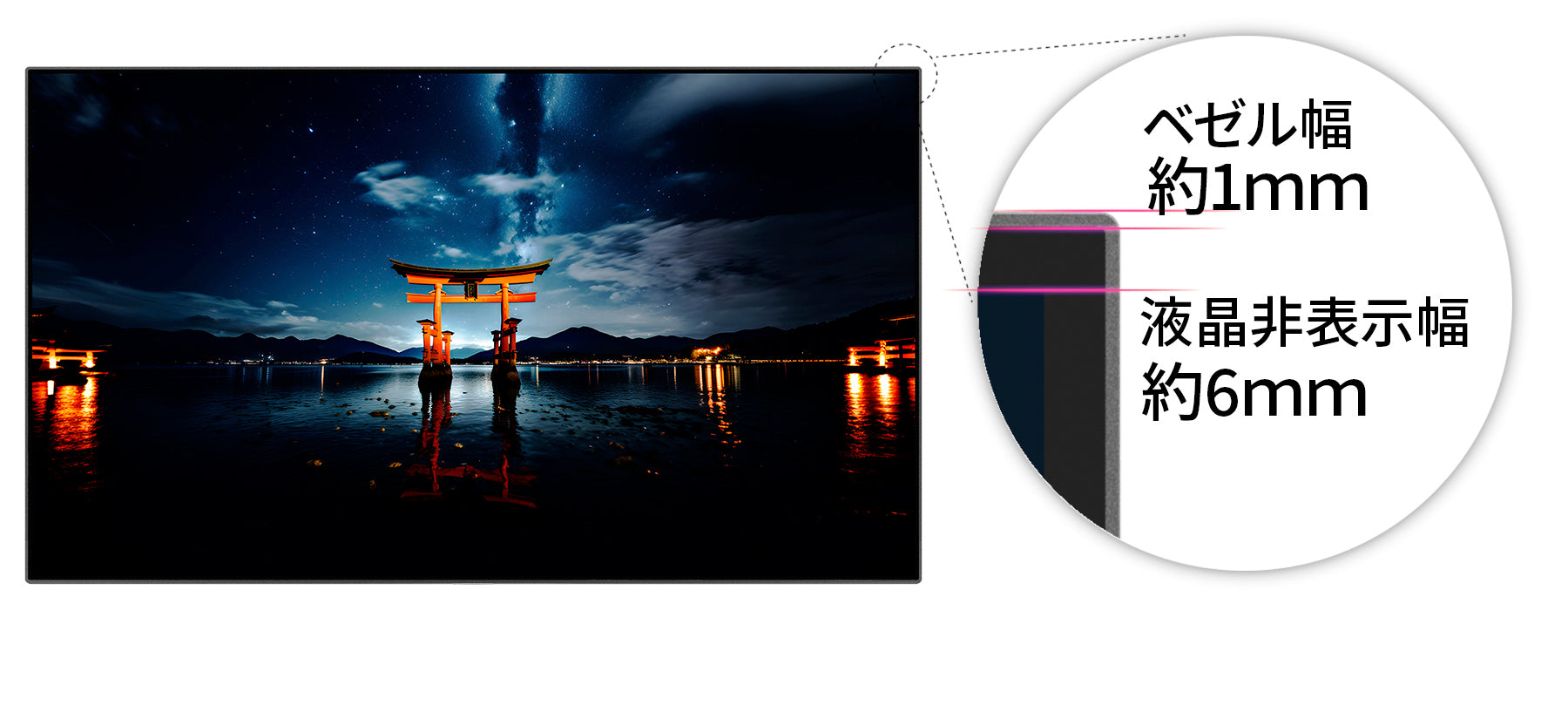 最大輝度400cd/m2、2000:1の高コントラスト比、10.7億色の表示色でHDR400相当の性能を持ちます。4辺フレームレスデザインを採用。浮かび上がるようにコンテンツを鮮やかに映し出します。4辺狭額縁パネルによる省スペース設計を行い、置く場所にも困らない使いやすいサイズを実現しました。また複数並べて使用するマルチディスプレイ構成にも最適です。