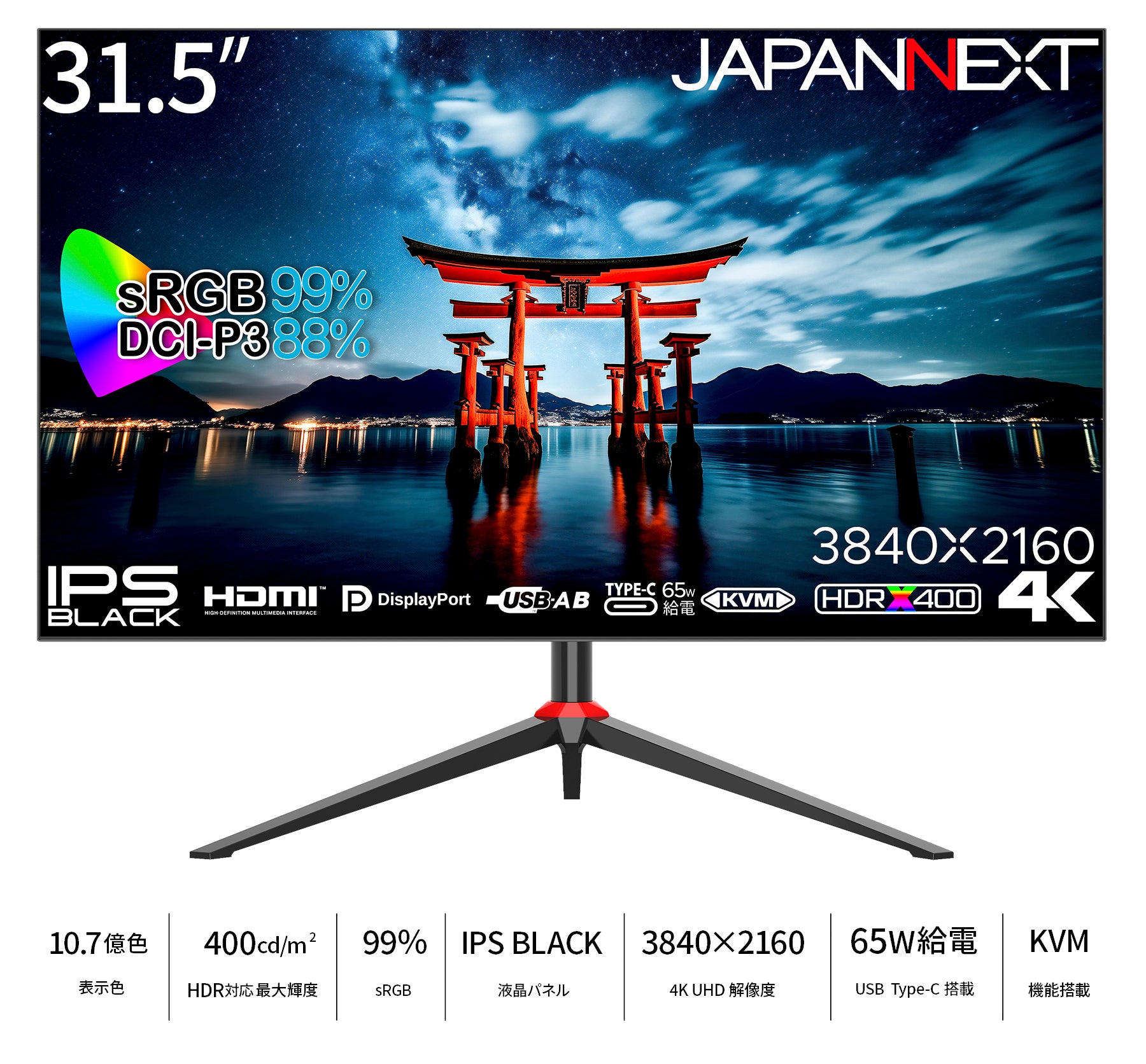 31.5インチのIPS BLACKパネルを搭載、IPS BLACKテクノロジーにより、従来のIPSパネルよりも高いコントラスト比(2000:1)を実現、より深い黒を表現します。sRGB99%の高い色再現により映像制作にも最適なモニターです。