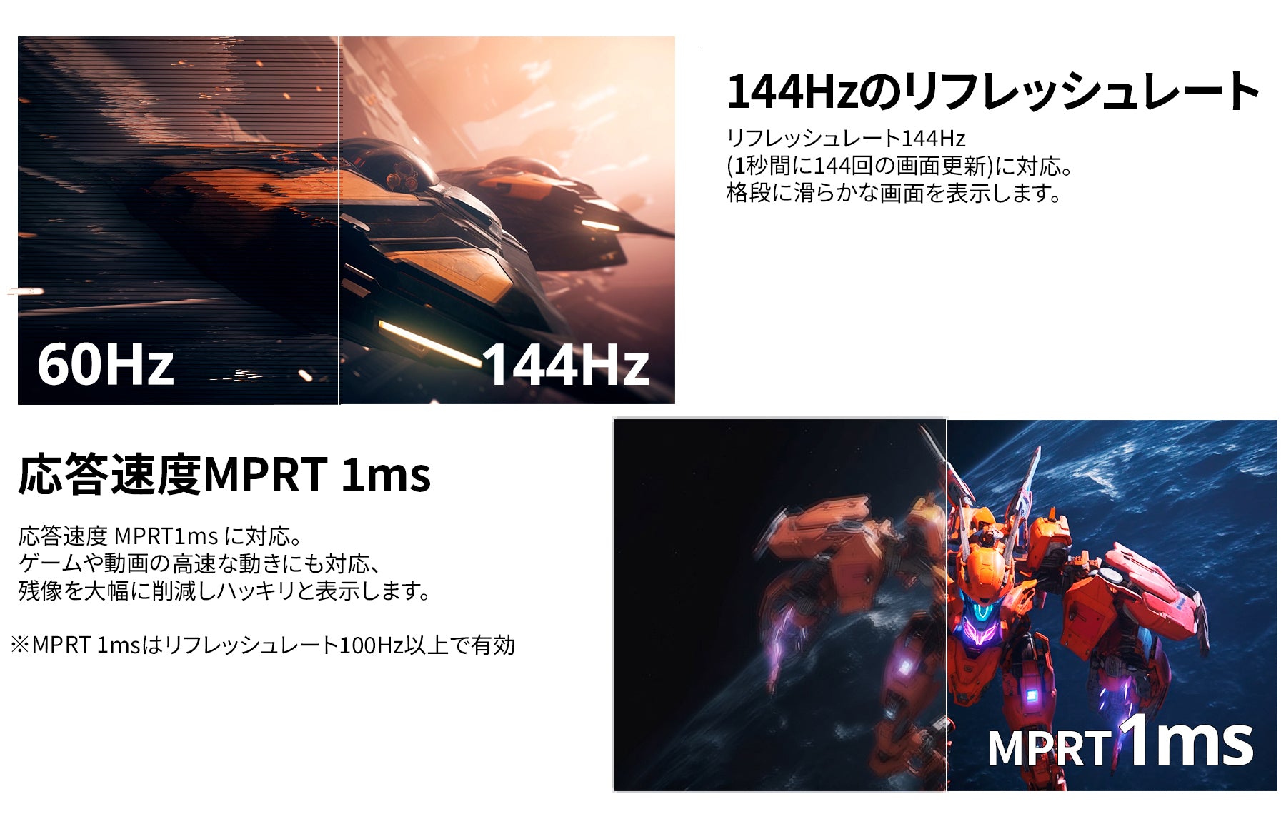 144Hzの高速リフレッシュレート、1ms(MPRT)の高速応答速度に対応。高精細で滑らかな表現を可能にし、FPSなどの動きの速いゲームで快適なゲームプレイを実現します。※MPRT 1msはリフレッシュレート100Hz以上で有効。