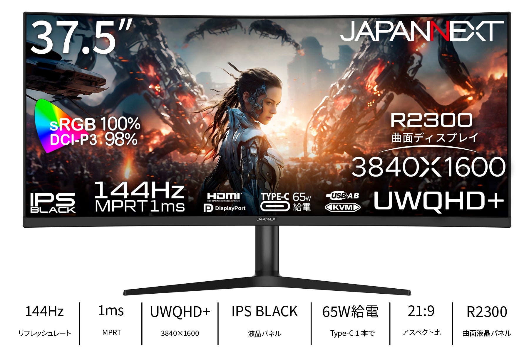 37.5インチのIPS BLACKパネルを搭載し、144Hzの高速リフレッシュレートに対応した、UWQHD+(3840x1600)解像度の湾曲ウルトラワイドゲーミングモニターです。