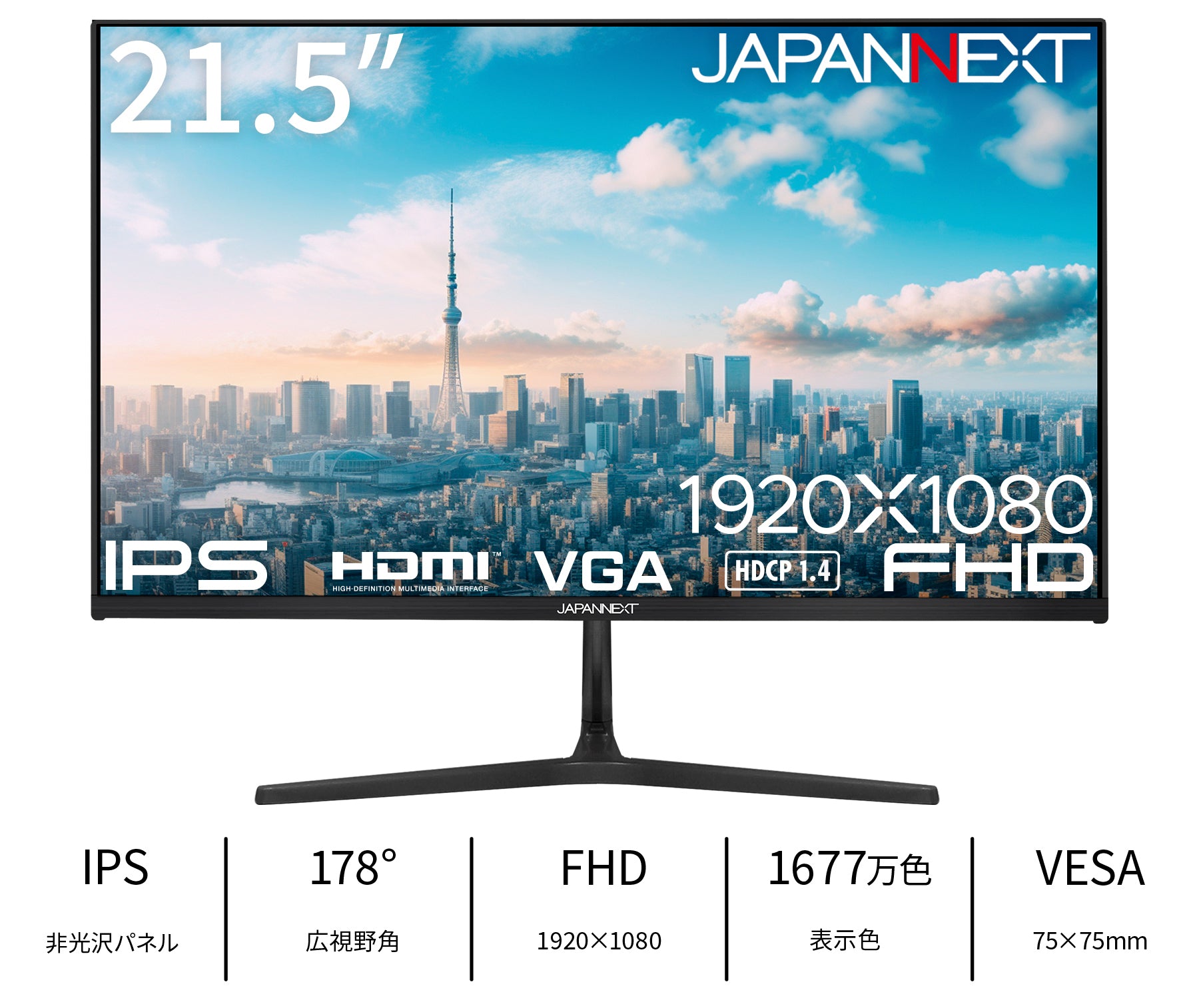 21.5インチのIPSパネルを搭載、使いやすいフルHD(1920x1080)解像度に対応した液晶モニターです。