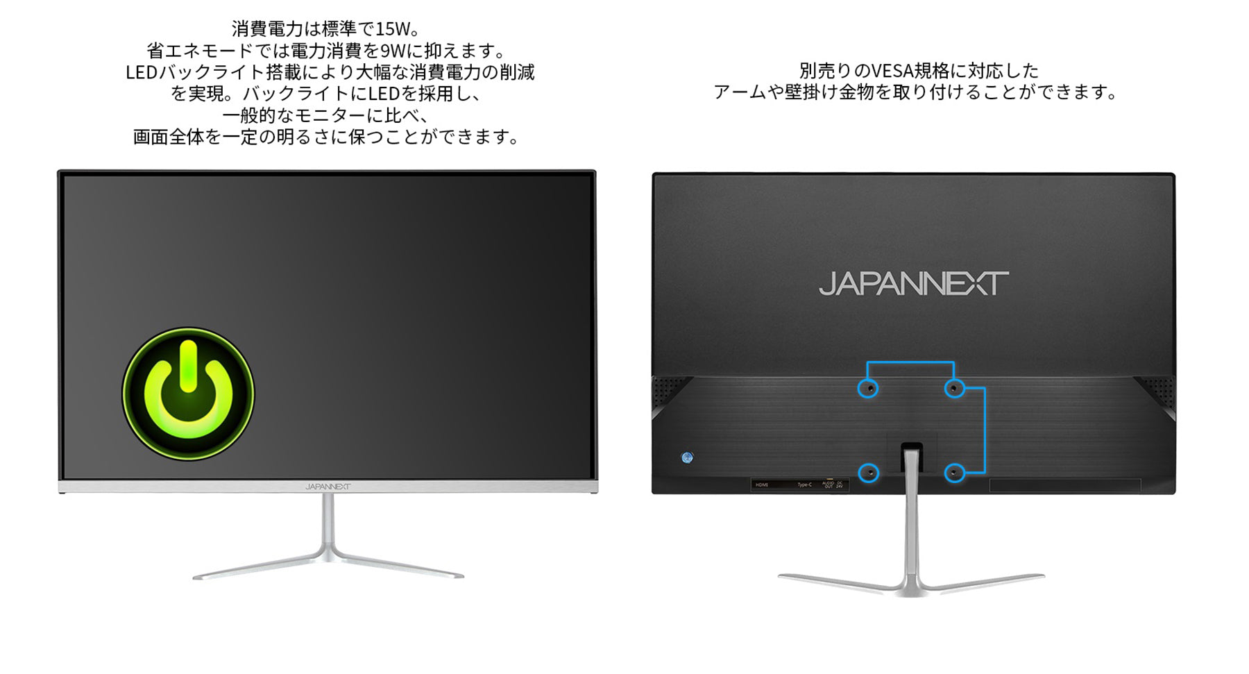 75x75mmのVESAマウントに対応しますので、別売りのモニターアームなどに使用が可能です。
