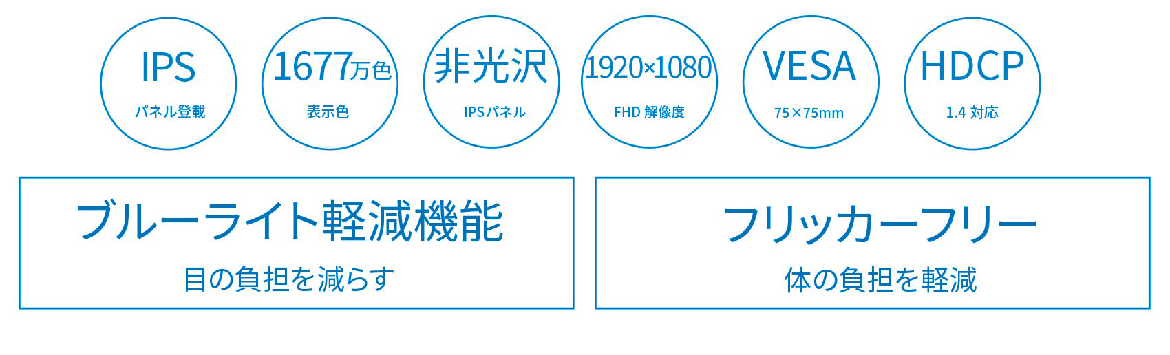 長時間使用時に眼に優しいフリッカーフリー(ちらつき軽減)、ブルーライト軽減モードを搭載します。