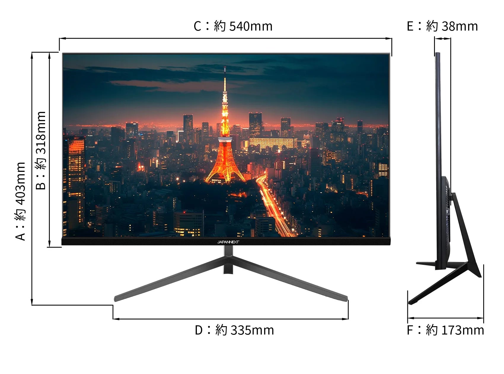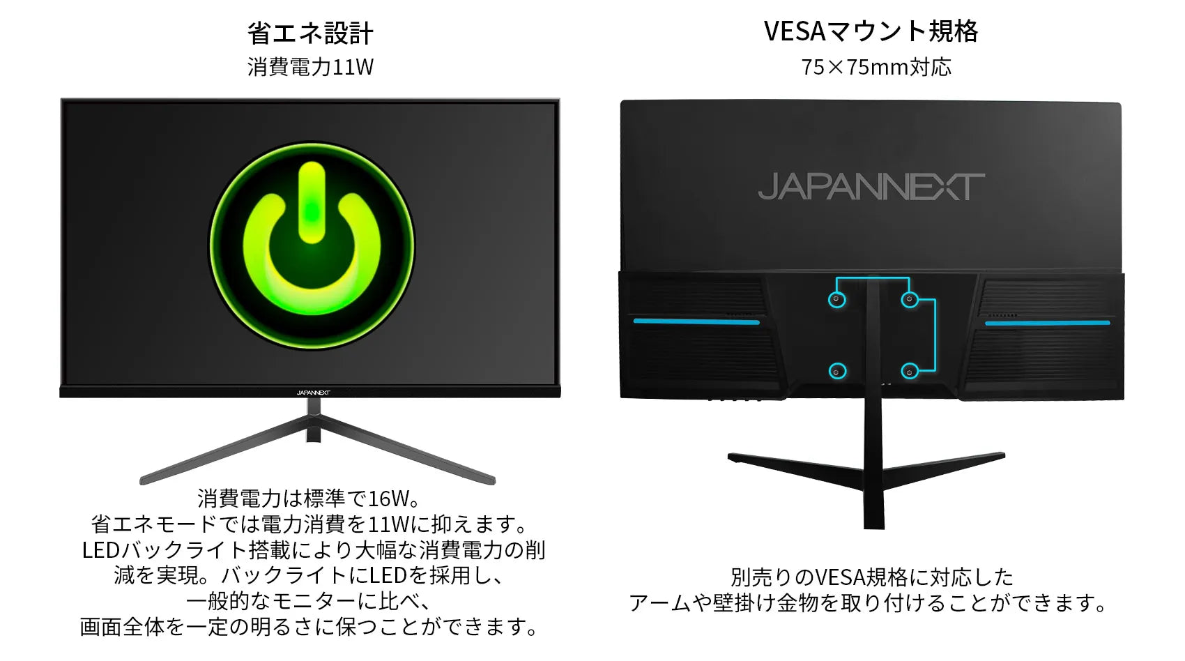 スタイリッシュなフレームレスデザインを採用しマルチモニターにも最適です。75x75mmのVESAマウントに対応しますので、別売りのモニターアームなどに使用が可能です。なおスピーカー、オーディオ出力端子は搭載しておりません。