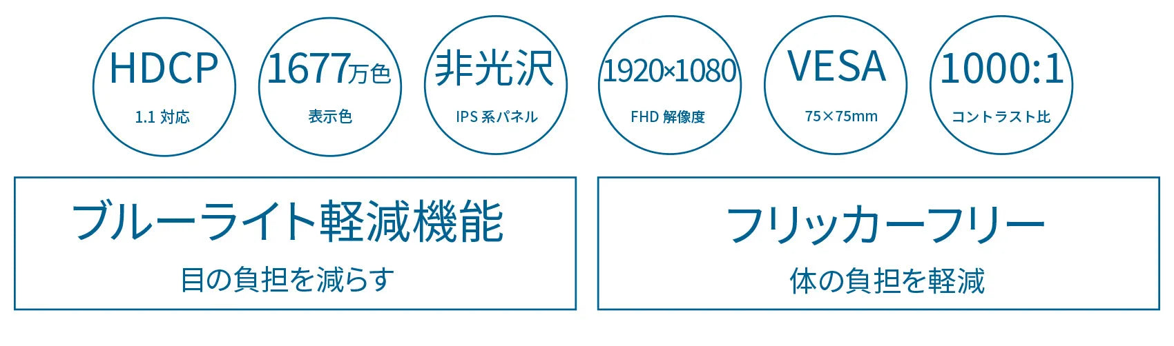 ・画面の点滅”フリッカー”を抑えてちらつきと光量を調整。目への負担が軽減されます。
