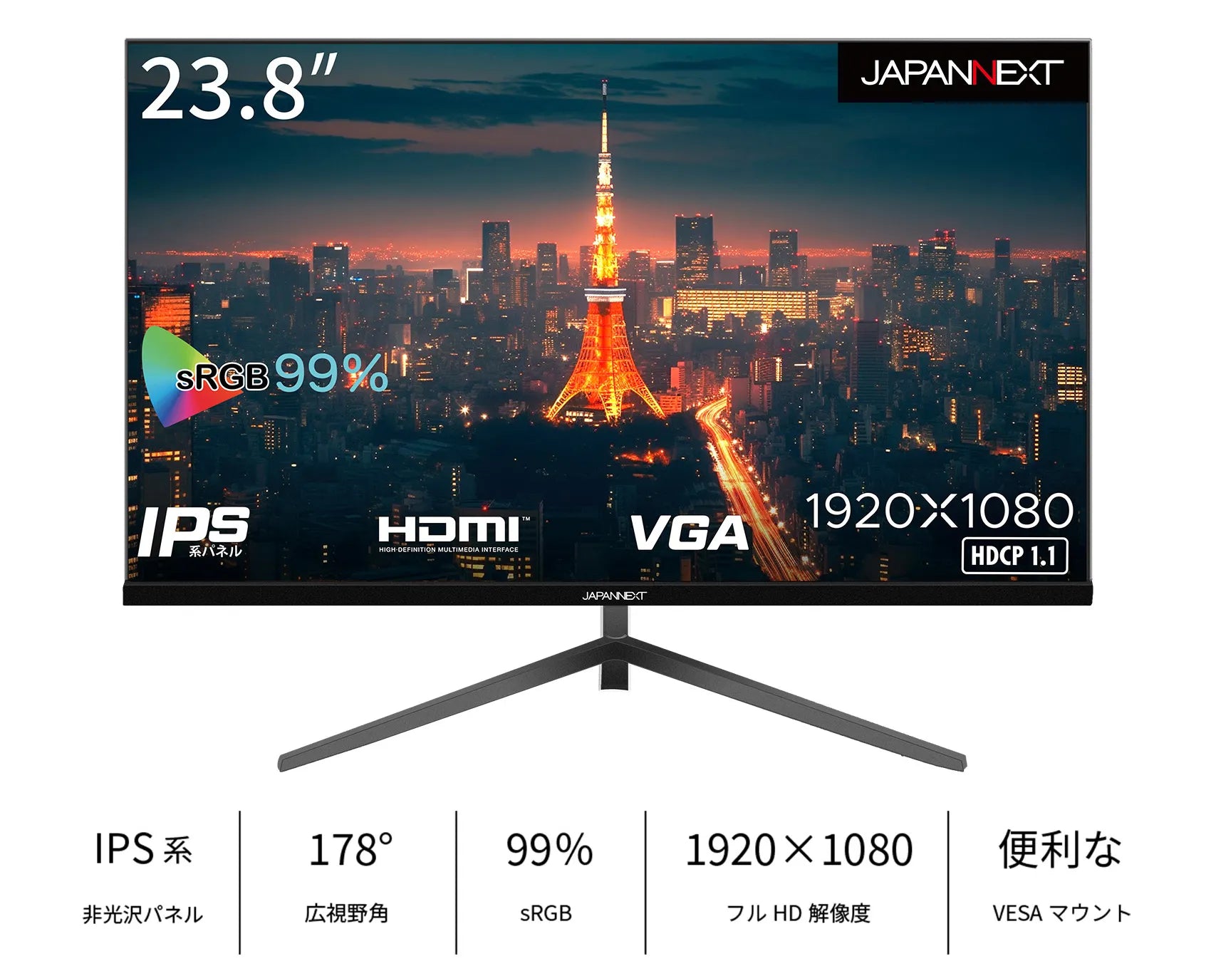 23.8インチのIPS系パネルを搭載、使いやすいフルHD解像度(1920 x 1080)に対応した液晶モニターです。上下左右178度に対応した高画質IPSパネルを搭載、sRGB 99%の広色域に対応しコンテンツを色鮮やかに映し出します。写真編集、動画編集などにも最適です。