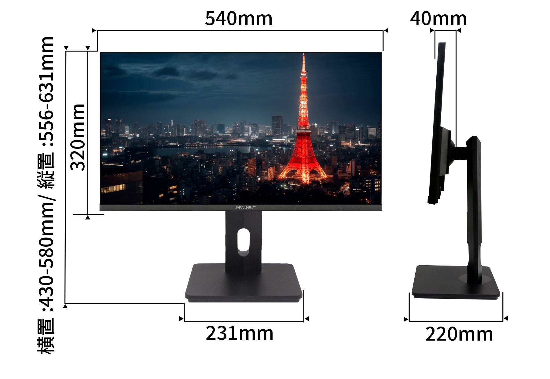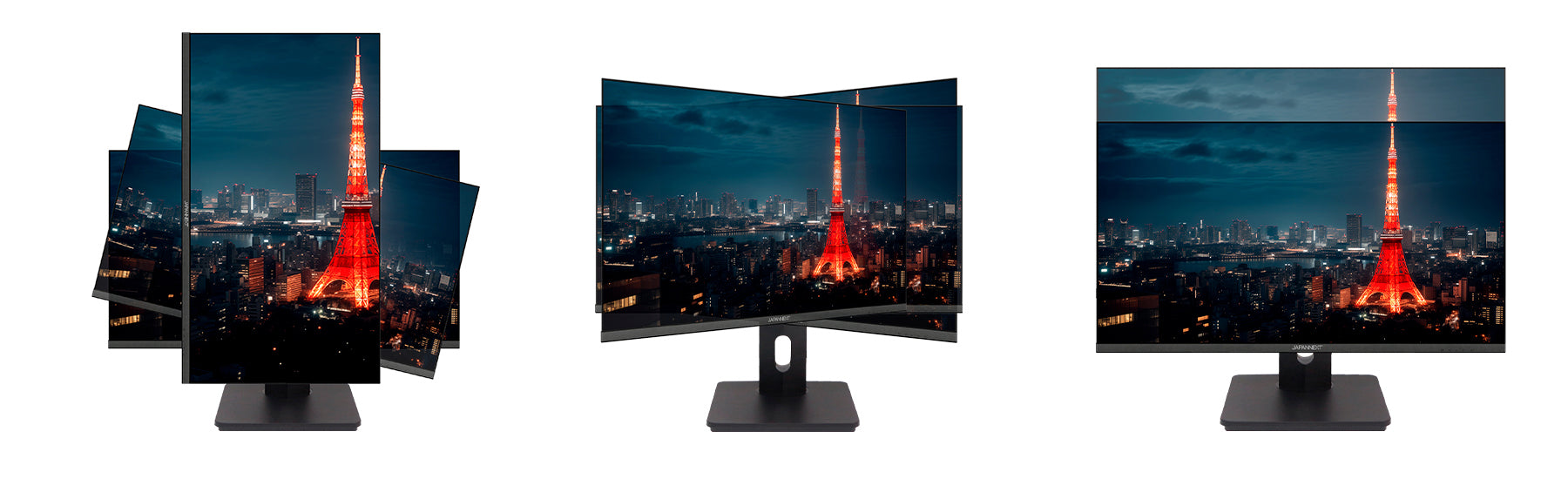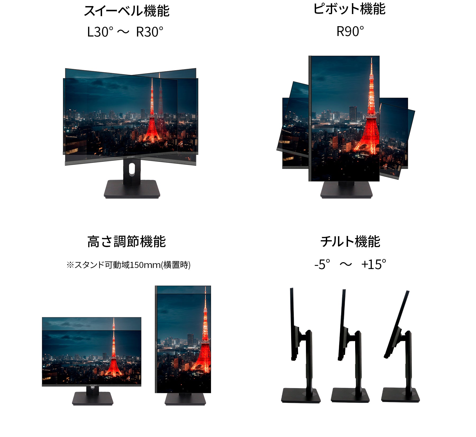高さ調整が可能な昇降式スタンドを搭載。最大150mm(横置時)の範囲内で最適な高さに画面を調整可能です。また縦画面として使用出来るピボット(回転)機能にも対応します。