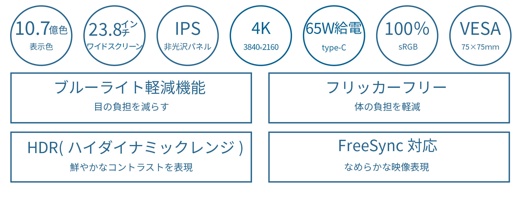 長時間使用時に眼に優しいフリッカーフリー(ちらつき軽減)、ブルーライト軽減モードを搭載します。