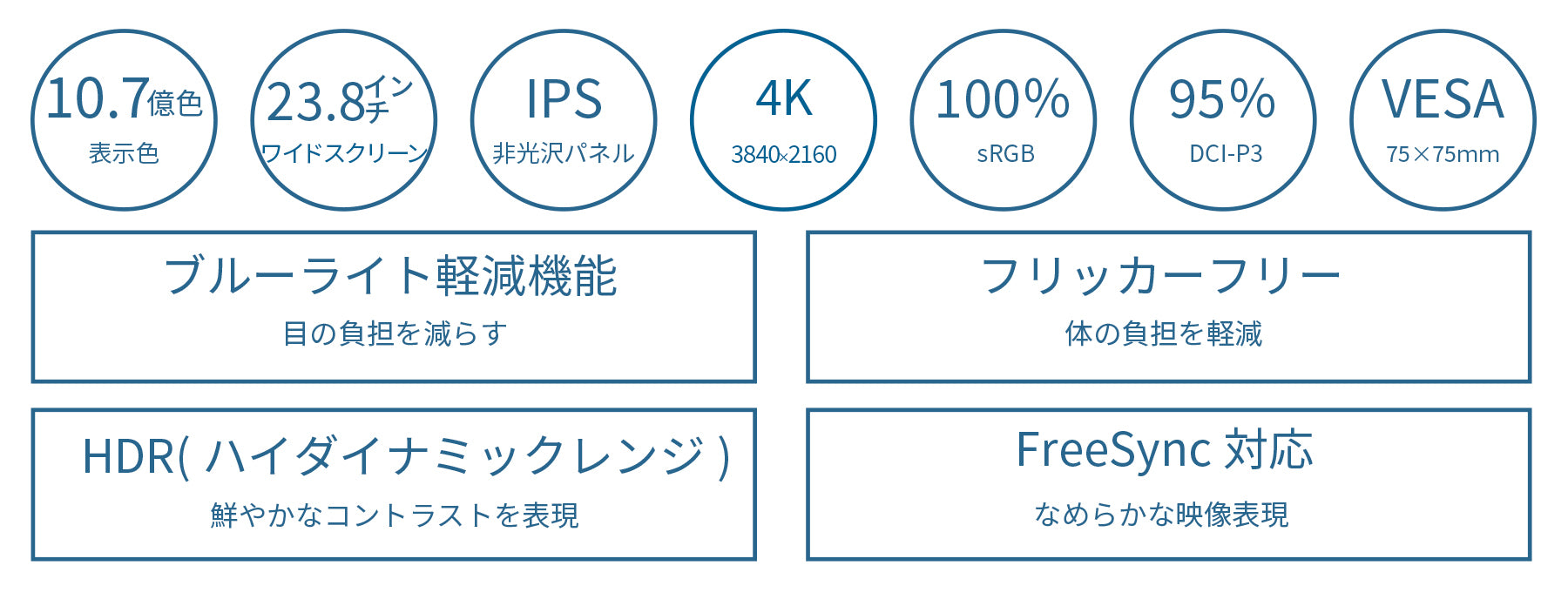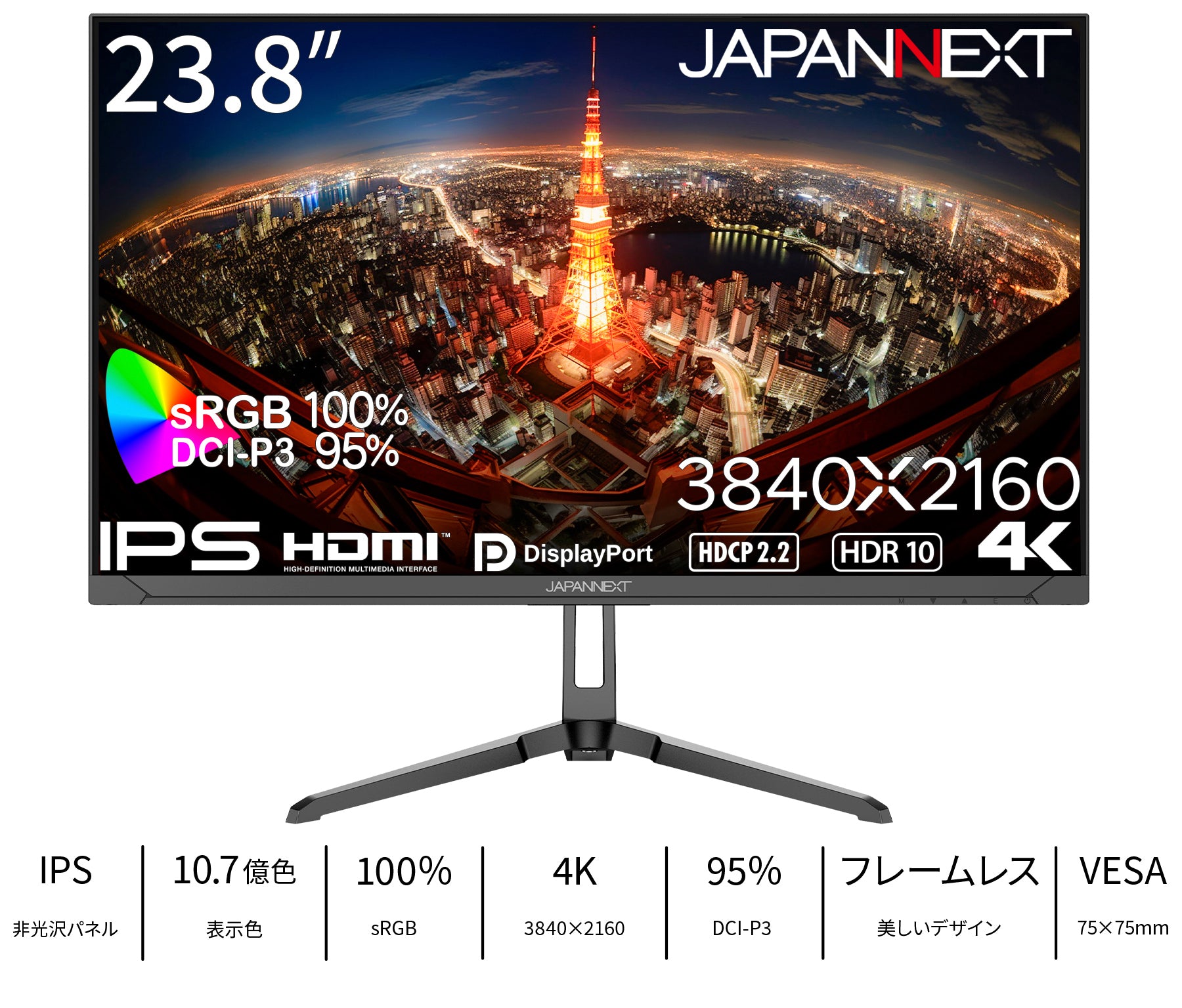 23.8インチのコンパクトサイズと4K(3840x2160)の高解像度を両立した省スペースながらも快適なデスク環境を実現した液晶モニターです。