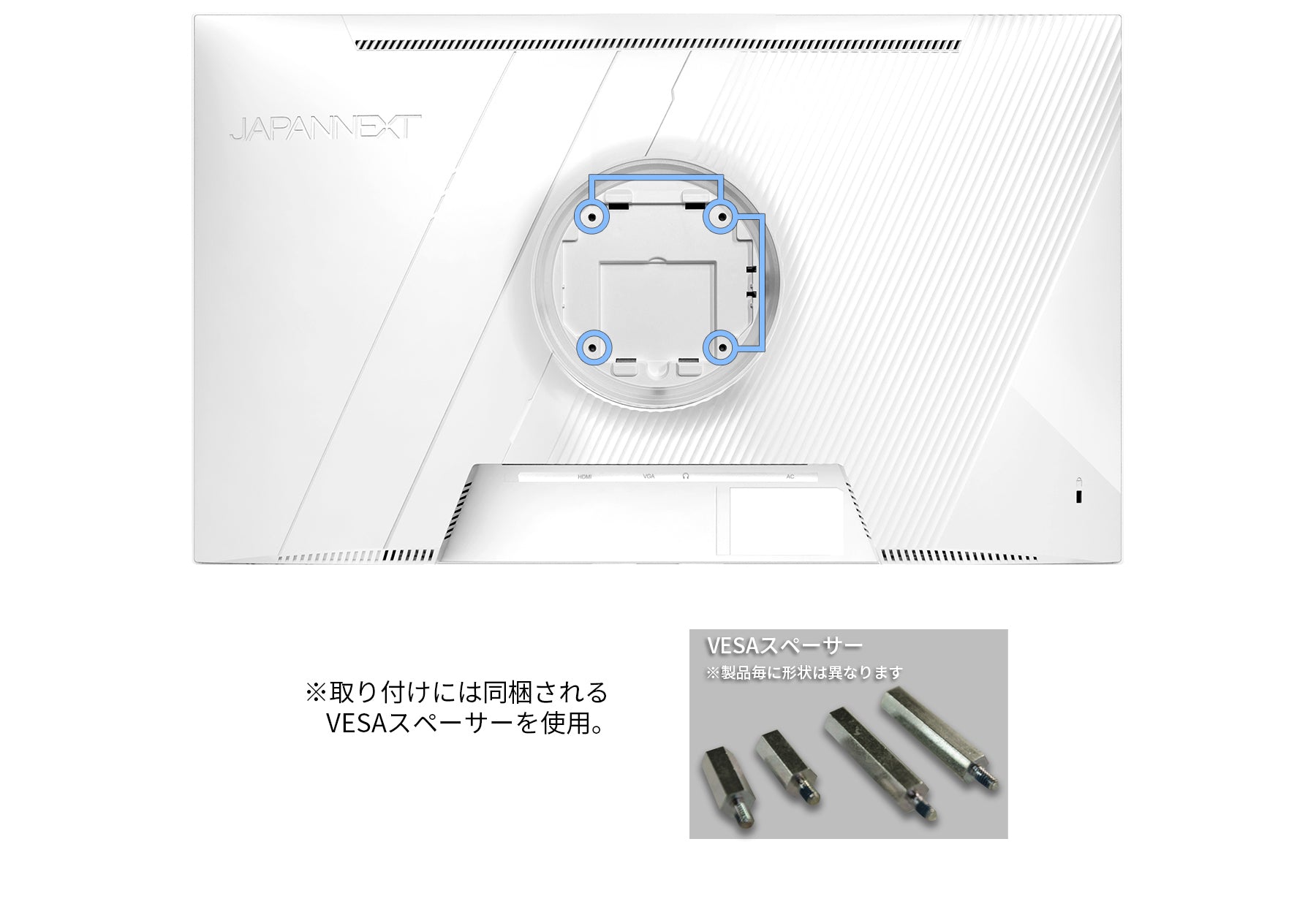 75x75mmのVESAマウントに対応しますので、別売りのモニターアームなどに使用が可能です。