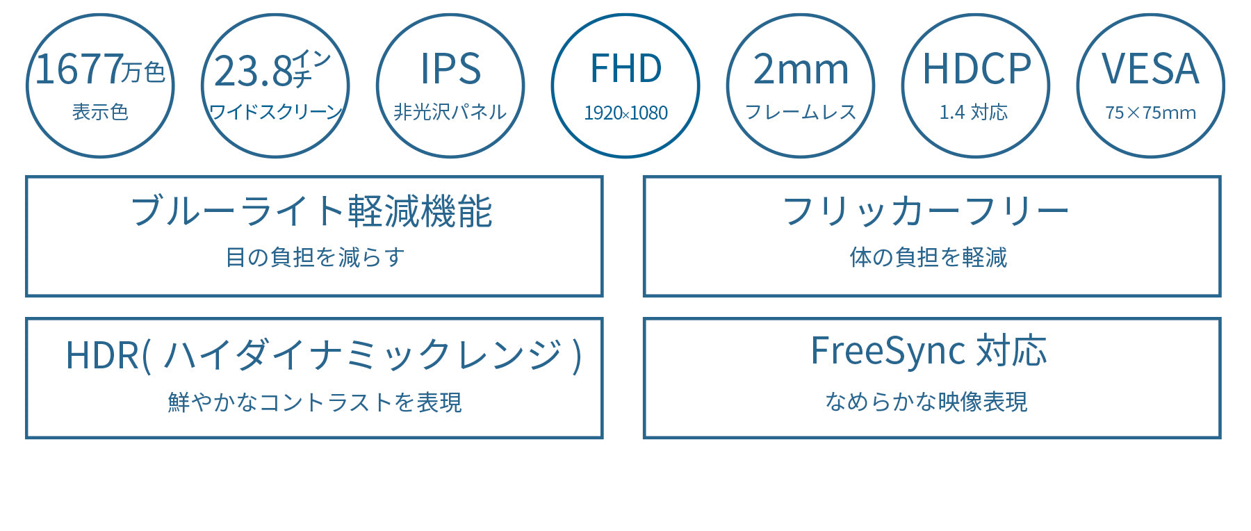 23.8インチの画面は省スペースながら大画面のセカンドモニターになり、テレワークにも最適です。長時間使用時に眼に優しいフリッカーフリー(ちらつき軽減)、ブルーライト軽減モードを搭載します。