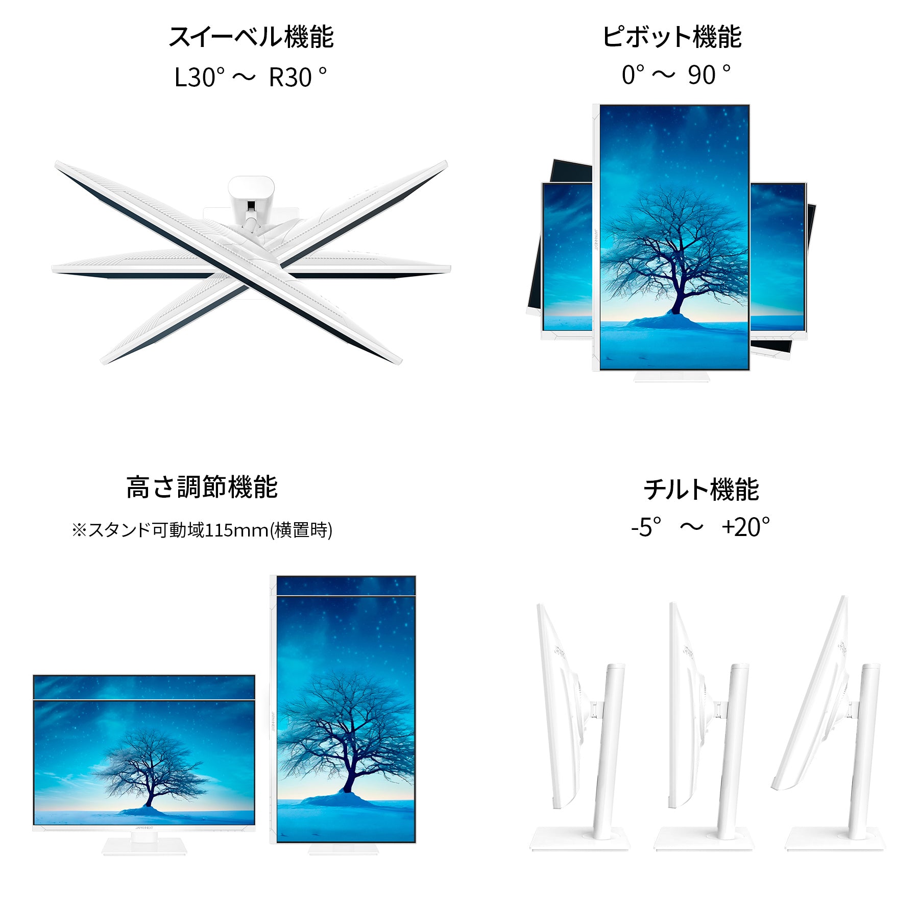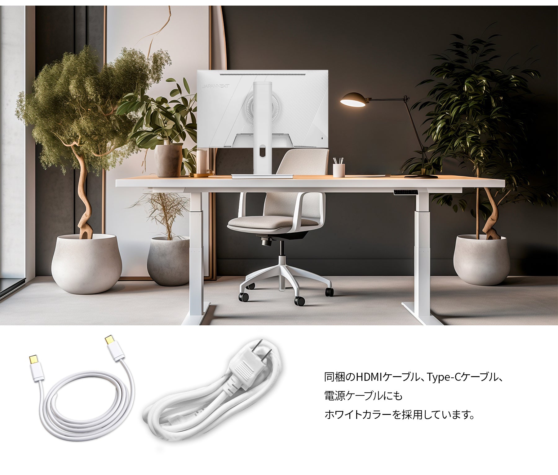 23.8インチのIPSパネルを搭載、使いやすいフルHD(1920x1080)解像度に対応し、本体カラーにホワイトを採用した液晶モニターです。モニターベゼルやスタンドも白となっており、爽やかでおしゃれな空間を演出したい場合や、デバイスを白で統一したい場合に最適です。さらに、付属のケーブル類全てにホワイトを採用、全体が白基調に統一された部屋や医療機関などでの使用にも最適です。