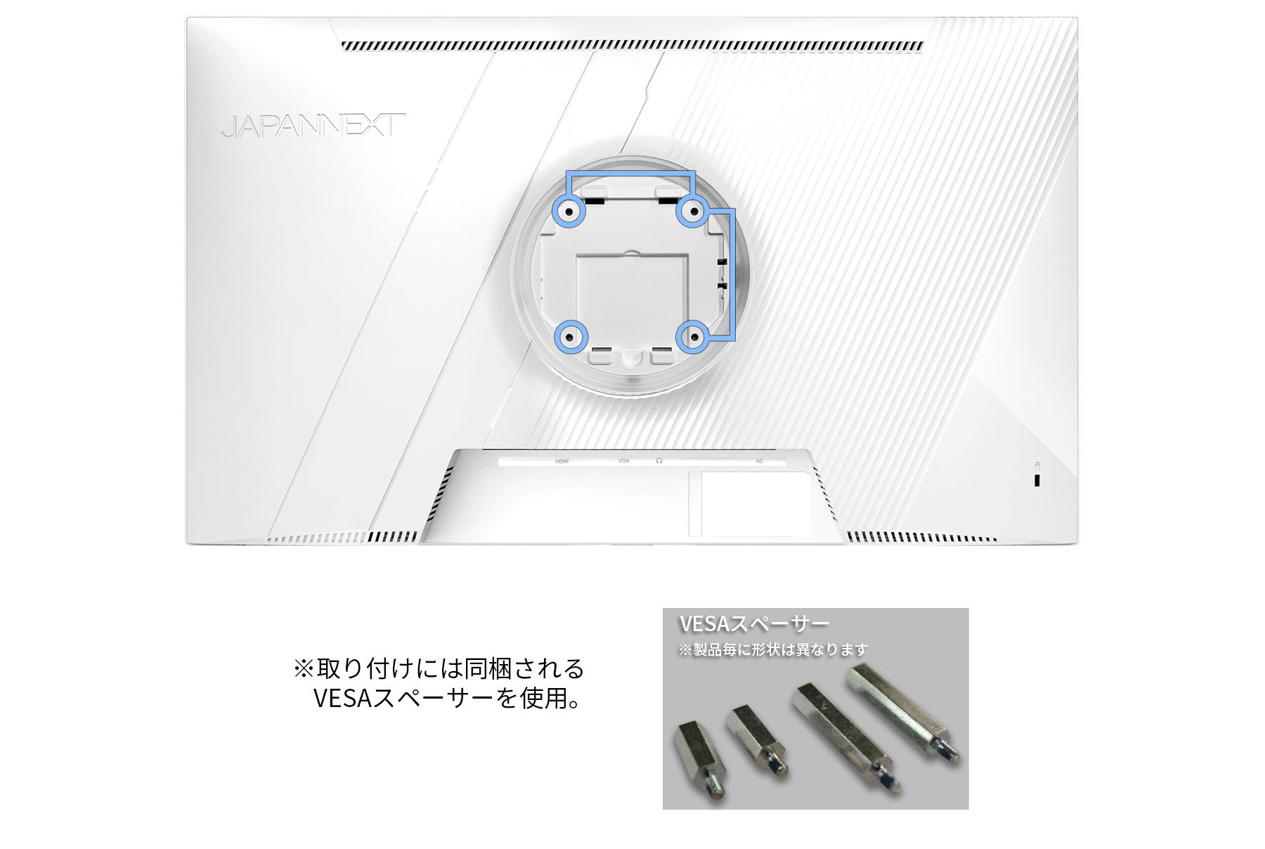 75x75mmのVESAマウントに対応しますので、別売りのモニターアームなどに使用が可能です。