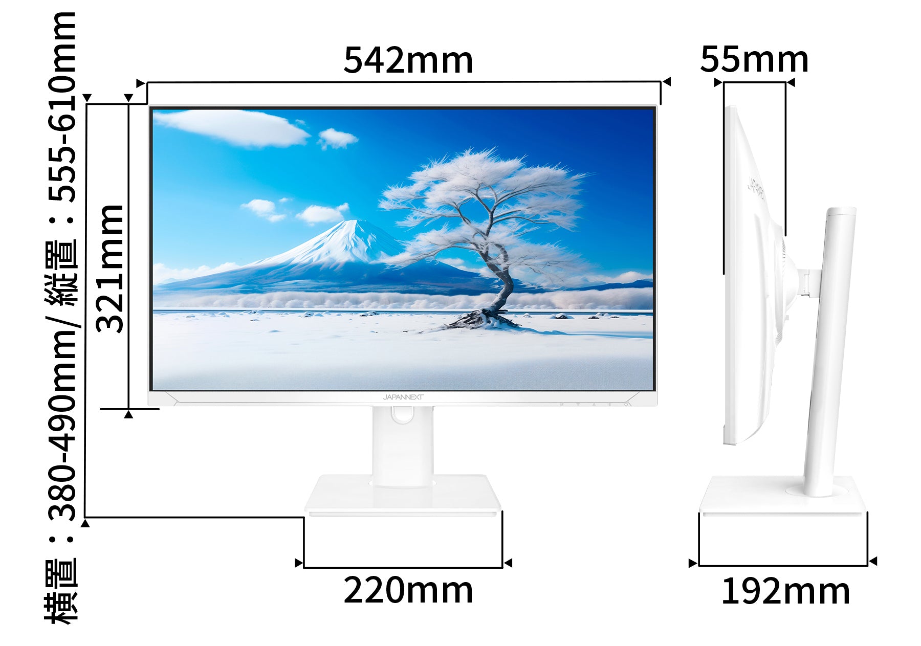 モニターベゼルやスタンドも白となっており、爽やかでおしゃれな空間を演出したい場合や、デバイスを白で統一したい場合に最適です。さらに、付属の電源アダプターとHDMIケーブルにもホワイトを採用、全体が白基調に統一された部屋や医療機関などでの使用にも最適です。