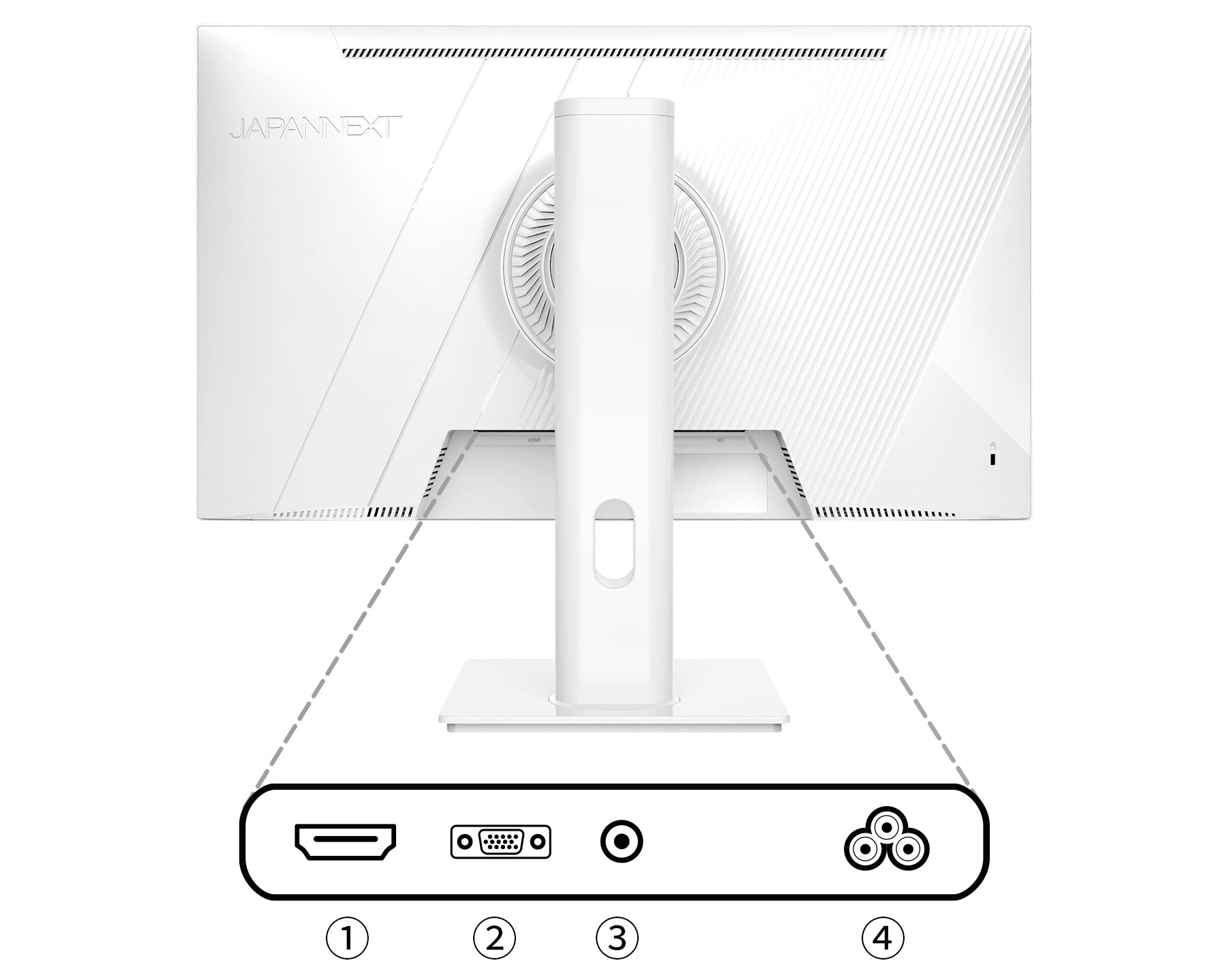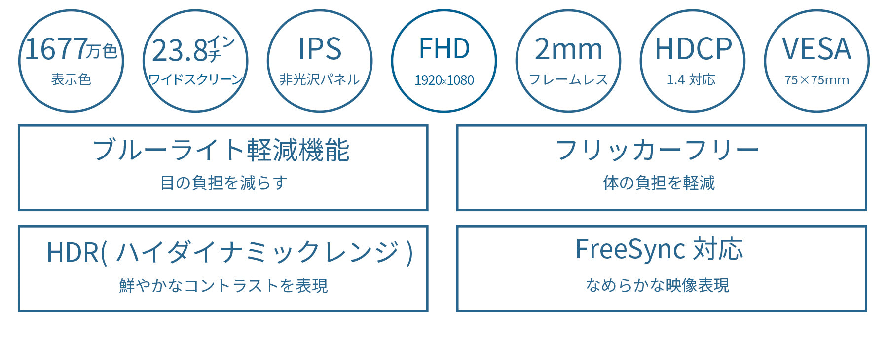 インターフェイスはHDMI1.4端子を1つとVGAの端子を1つ搭載しています。VGA端子を装備しますので、以前から使用しているパソコンも接続でき、様々な使用用途に向いています。23.8インチの画面は省スペースながら大画面のセカンドモニターになり、テレワークにも最適です。
