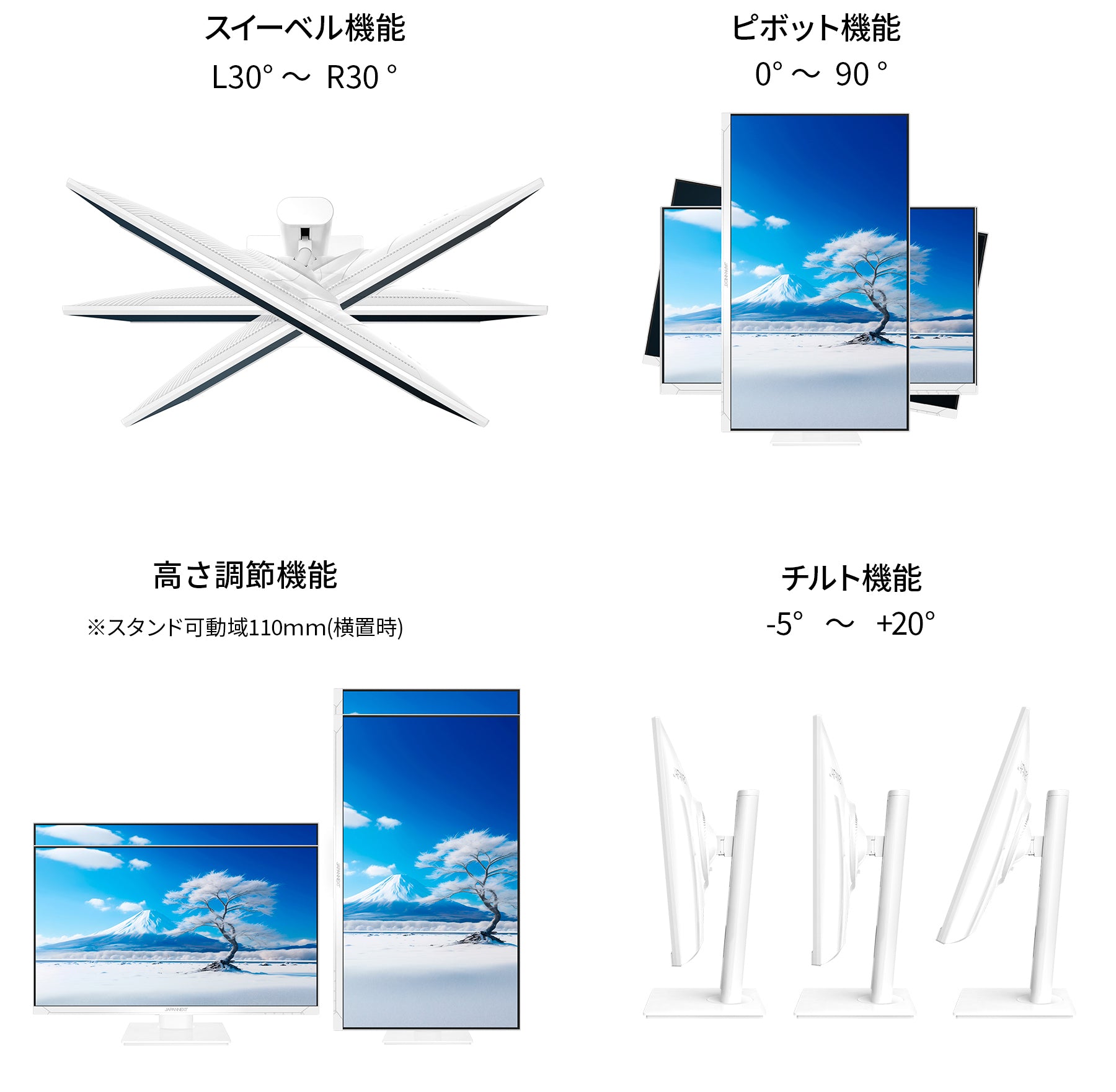 高さ調整が可能な昇降式スタンドを採用、お好みの高さにモニターを固定できます。さらにピボット(回転)機能にも対応、縦でも使用することが出来ます。