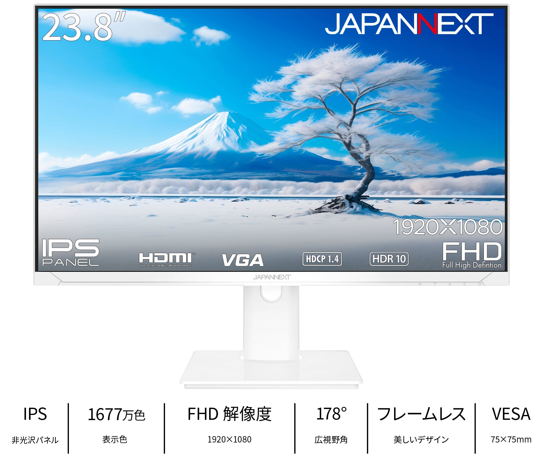 23.8インチのIPSパネルを搭載、使いやすいフルHD(1920x1080)解像度に対応し、本体にホワイトカラーを採用した液晶モニターです。