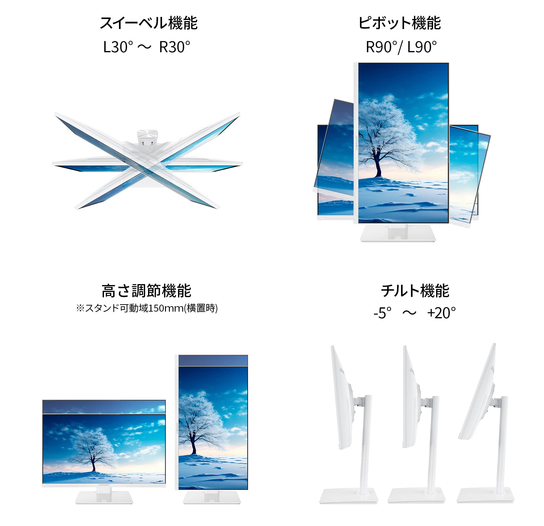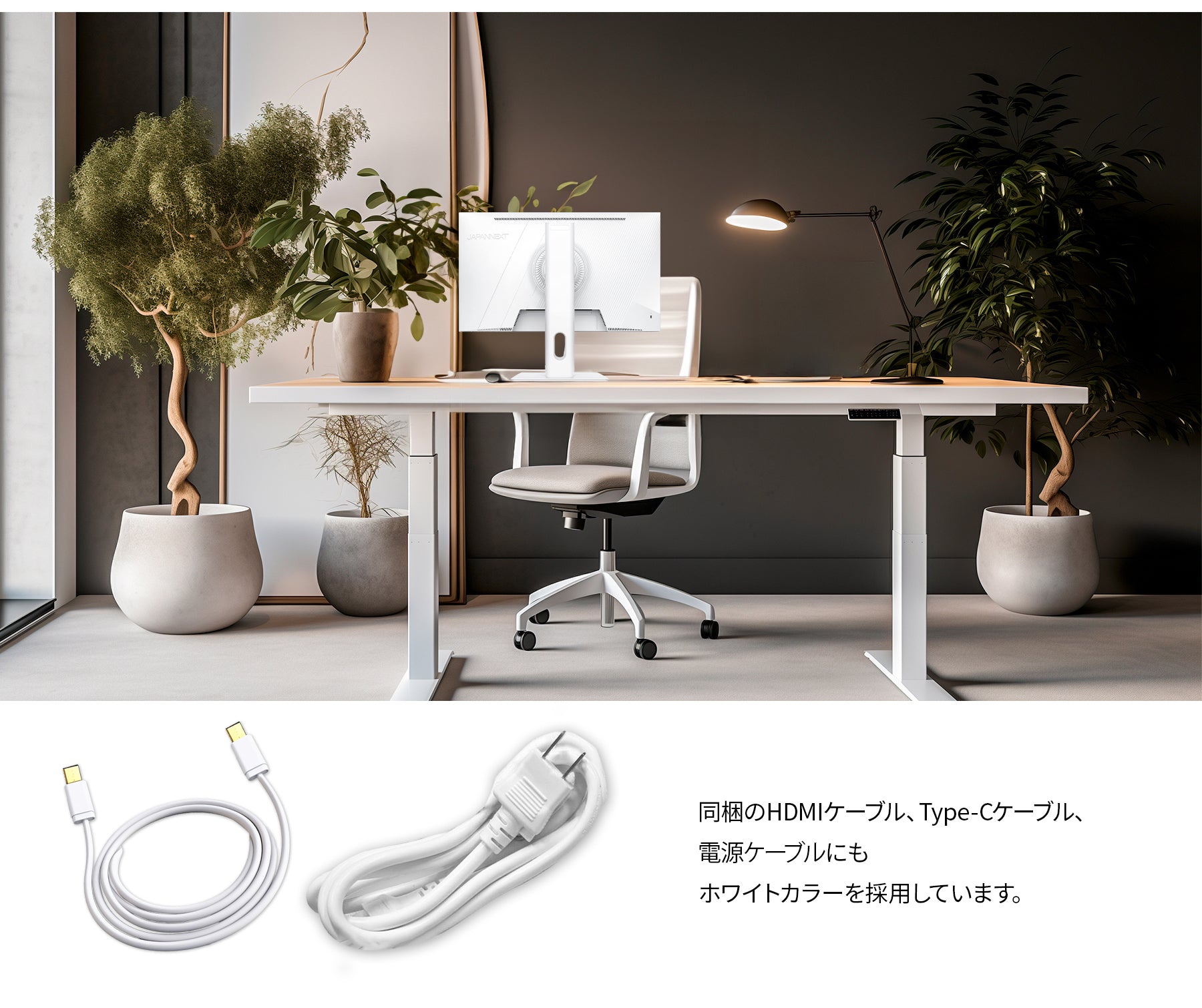 本体カラーにホワイトを採用。モニターベゼルやスタンドも白となっており、爽やかでおしゃれな空間を演出したい場合や、デバイスを白で統一したい場合に最適です。さらに、付属のケーブル類全てにホワイトカラーを採用。全体が白基調に統一された部屋や医療機関などでの使用にも最適です。